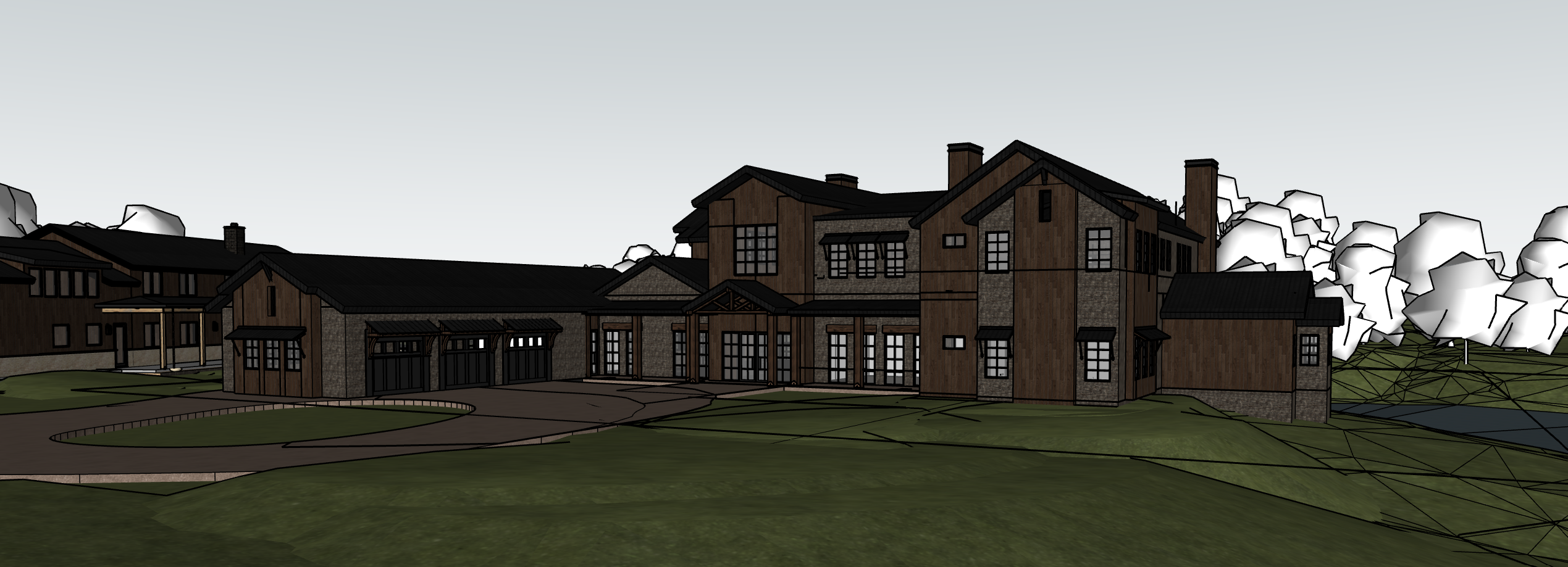 make brown elements reclaimed wood make gray areas dark moss rock stone all roofs and awnings are black metal standing seam make the lighting look like golden hour ultra realistic render landscaping from american sothwestern with succulents cacti and yuccas