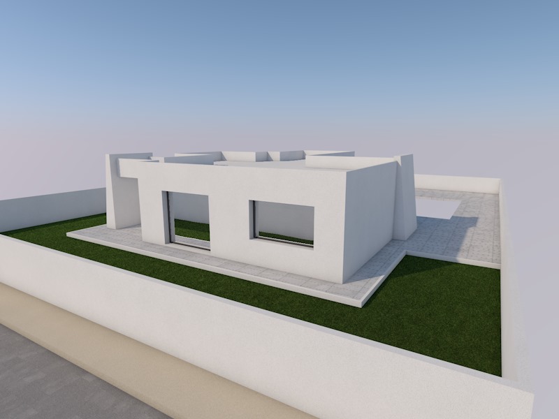 ultra realistic architectural rendering of a modern mediterranean luxury villa white plaster facade clean geometric volumes elegant balconies with black wrought iron railings large floor to ceiling glass windows warm interior lighting glowing at dusk private swimming pool in the foreground minimal landscaped garden with lush greenery manicured lawn palm trees and mediterranean plants outdoor garden furniture including sun loungers sofas coffee tables and dining area light stone paving premium real estate style soft sunset sky cinematic lighting high end materials sharp details 8k photorealistic architectural visualization