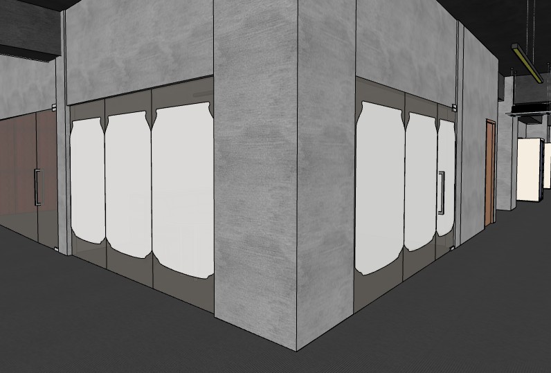 an exterior of an office room with frosted glass sticker of a silloutte of drink cans on the glass walls and door the exterior has a stucco finish the floor is gray carpet