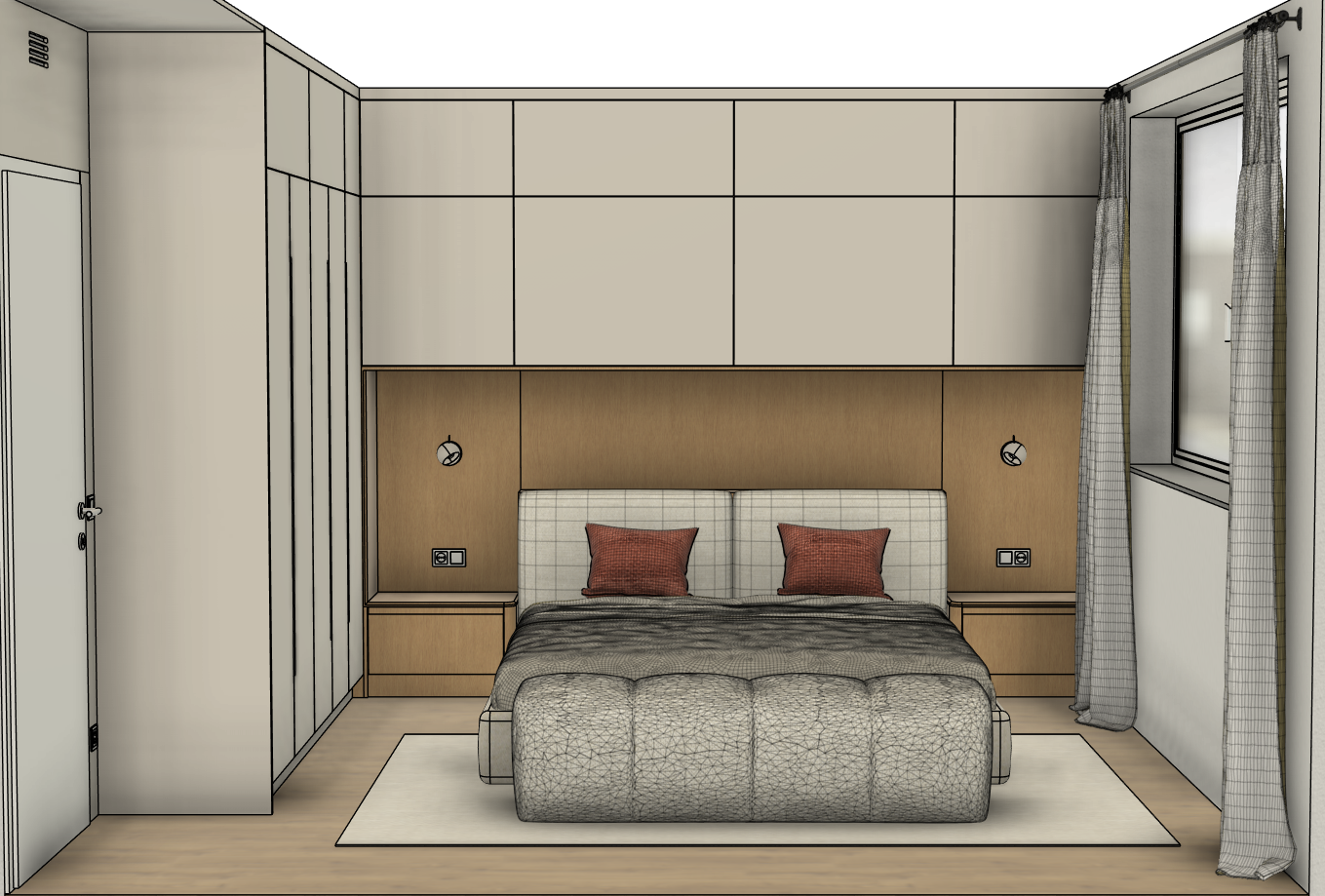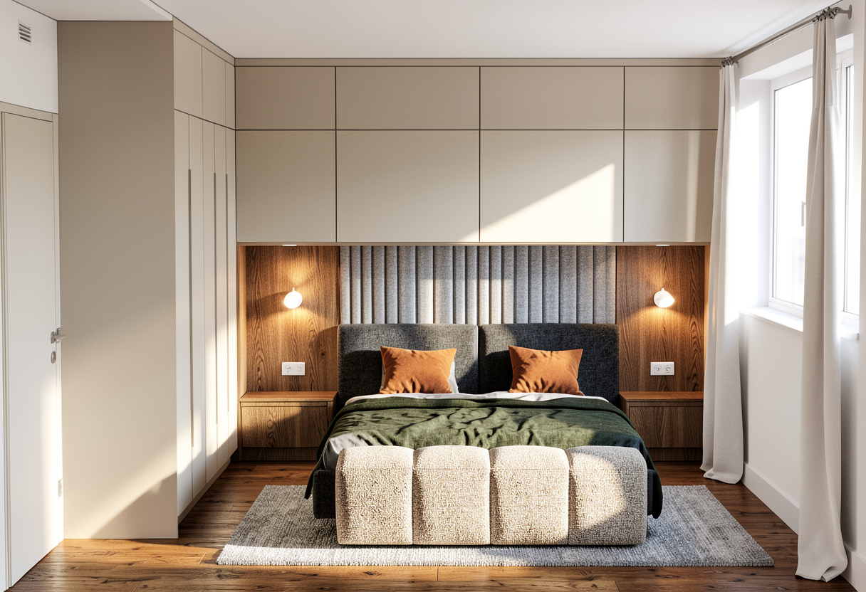 photorealistic render of the detailed bedroom interior from image 0 png using exact camera perspective and spatial layout the room is bathed in warm natural sunlight streaming directly from the large window on the right the floor features rich warm oak wood planks the extensive wardrobe and all upper cabinetry following the precise contours and panel lines including the subtle door gaps and minimal handle profiles from image 0 png are in a chalk beige finish above the bed there is a continuous row of flat panel upper cabinets in the same chalk beige finish spanning the wall between the wardrobes these cabinets have clean minimal divisions and precise panel lines matching the cabinetry design in image 0 png directly below the upper cabinets there is a recessed wall niche made of authentic oak veneer the wooden niche spans behind the bed and integrates the nightstands creating a continuous horizontal wooden element across the wall the niche has warm natural oak texture and subtle soft lighting reflections the wooden elements including the nightstands and lower cabinets are finished in authentic oak veneer the bed upholstered in dark grey textured fabric with cinamon color pillows and dark green blanket and light grey sheet remains unchanged the two specific white wall mounted reading lights from image 0 png are preserved with their exact design and are turned on casting warm directional light all switches and sockets above the nightstands are white and integrated smoothly into the wooden niche the foot of bed bench ottoman is covered in a detailed textured fabric with in a natural beige melange color with all mesh lines removed the floor rug is light grey with a rich soft carpet texture all textiles including bed linens and the white window curtains are rendered with natural folds and realistic material properties with no mesh lines visible the white ceiling and white walls provide context all edges are clean and precise but smooth with zero visible wireframes