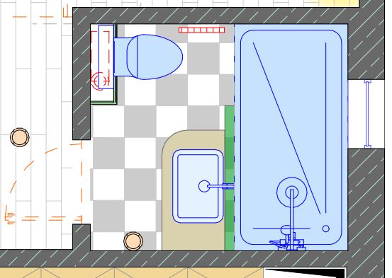 a small modern bathroom the toilet is on the left and is a built in toilet the cupboard with the sink is a red classical style cupboard the sink is white the walls have a black textured finish that resembles marble the floor is checkered with black and white tiles the mirror above the sink is a classical style mirror with a detailed gold frame above the mirror there is a modern liniar wall sonce suited for bathrooms the shower is also finished with black textured finish that resembles marble the shower is hidden after the wall with the sink and mirror and is visible on the left side of the room there is a small window on the back wall facing the toilet soft natural daylight enters from the window creating realistic shadows