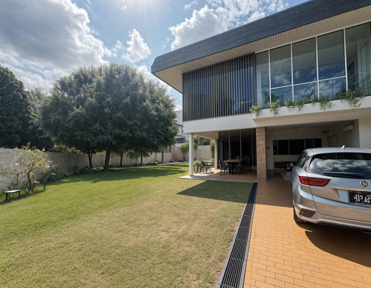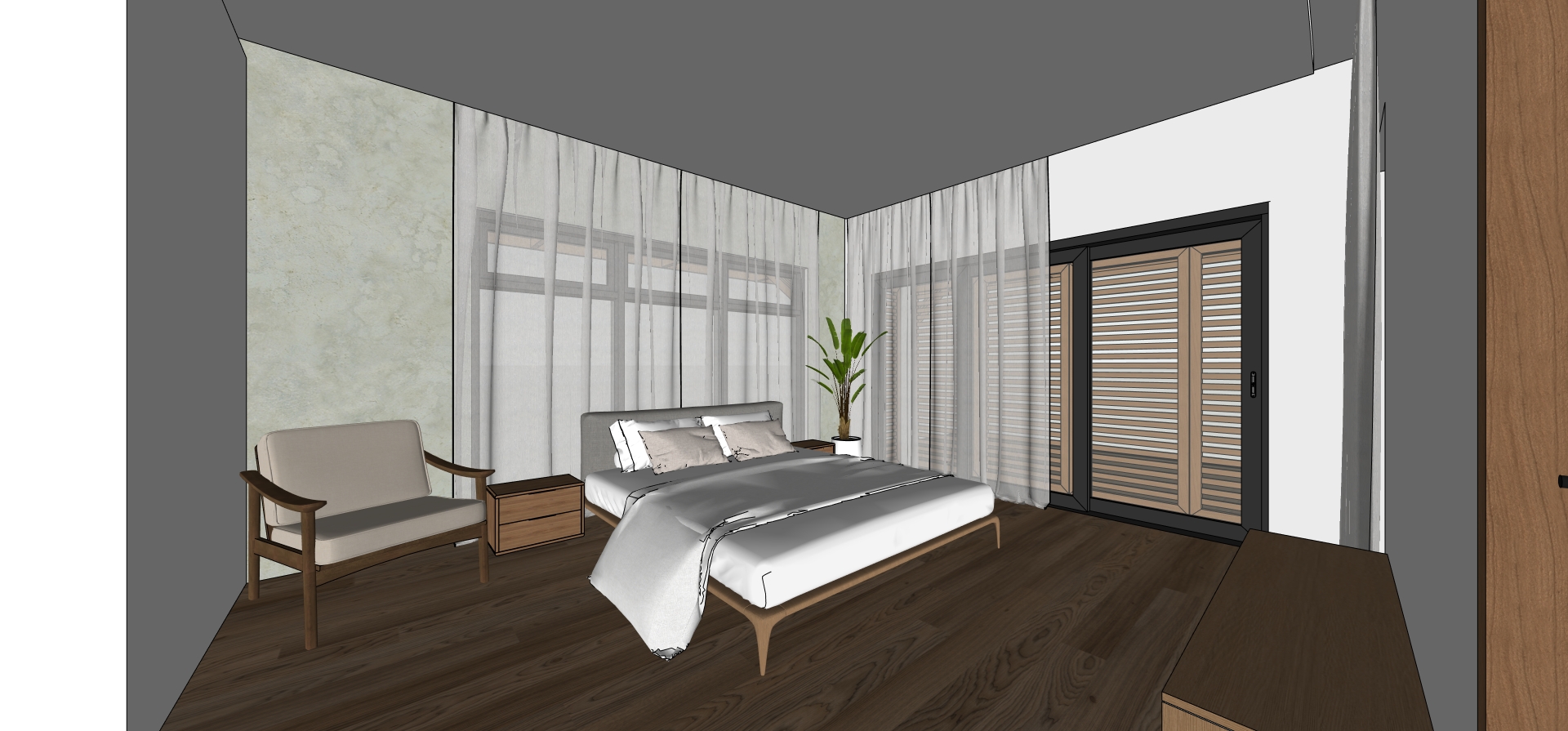 a serene bedroom the room features a plush cozy bed with soft white linens and a light brown textured throw blanket rich warm wood tones encompass the bed frame and floor creating an inviting earthy atmosphere large glass doors open up to a deck where natural light dances across the wooden floorboards casting gentle shadows a gentle breeze flows through the sheer cream colored curtains adding to the peaceful sunlit ambiance