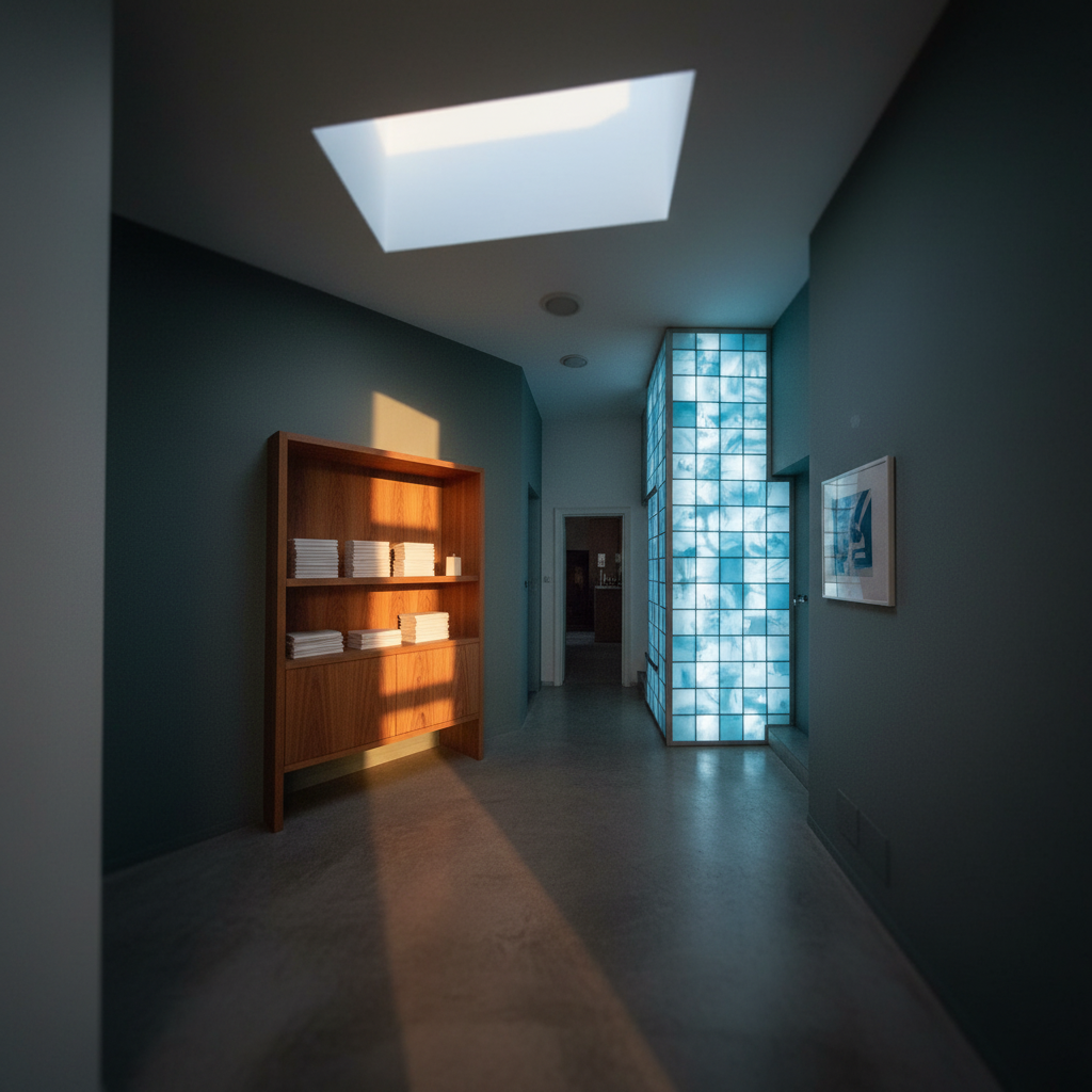 apreserve exactly the architectural layout and proportions of this image and adjust the materiality the floor should be a deep chocolate brown glossy penny tile with each tile 1 5 in diameter and the grout should be a medium brown the blue shower enclosure should be 4in sq moroccan zellij tile in a blend of colors from zia tile portuguese blue glacier blue and skylight the cabinetry shown should be wanut like henry built natural walnut cabinetry it should sit within a niche with a cased opening with a transitional moulding profile on the walls that are not tile incorporate traditional beadboard and chair rail ending 42 from the floor with a 2 5 baseboard and 3 casings around the door openings the walls and wainscot should be painted the color sizing by farrow and ball in an eggshell finish leave the ceilings white eliminate the door going into the shower it would just be open to a shower tiled full height make the lighting warm and glowy and give the image a sensibility of an organic modern space inspired by 1970 s california sunny vibes