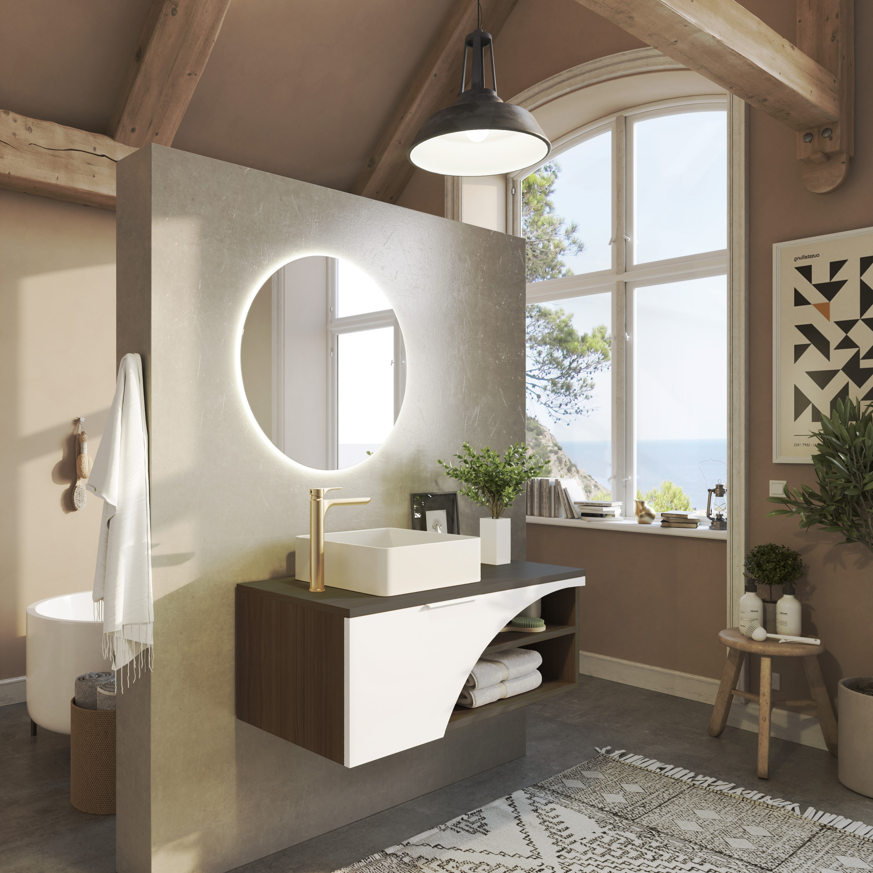 maintaining the bathroom furniture and the mirror change the architecture of this render with the premise that the camera s point of view remains and that there is a window in the scene