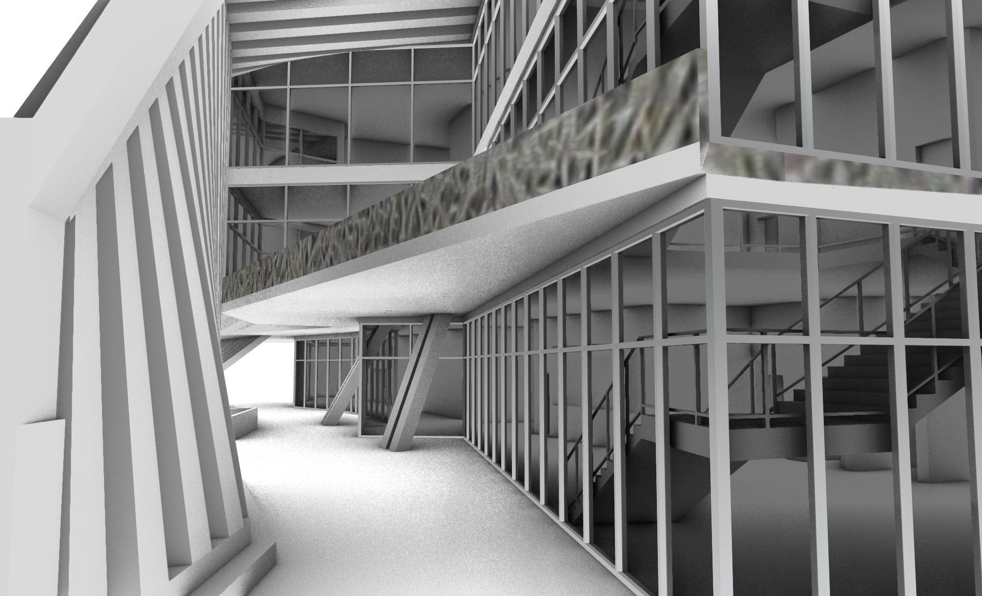modern cultural building with sculptural geometry exterior uses raw gray concrete and matte beige aluminum panels upper volumes have warm beige acm cladding with clean grid joints large curtain wall glazing with warm gray mullions steel diagonal members and exposed structure floors use large porcelain tiles in warm beige railings in brushed steel interior features open lobby tilted columns layered ceilings and a performance theater with acoustic panels soft daylight realistic clean high end architectural render