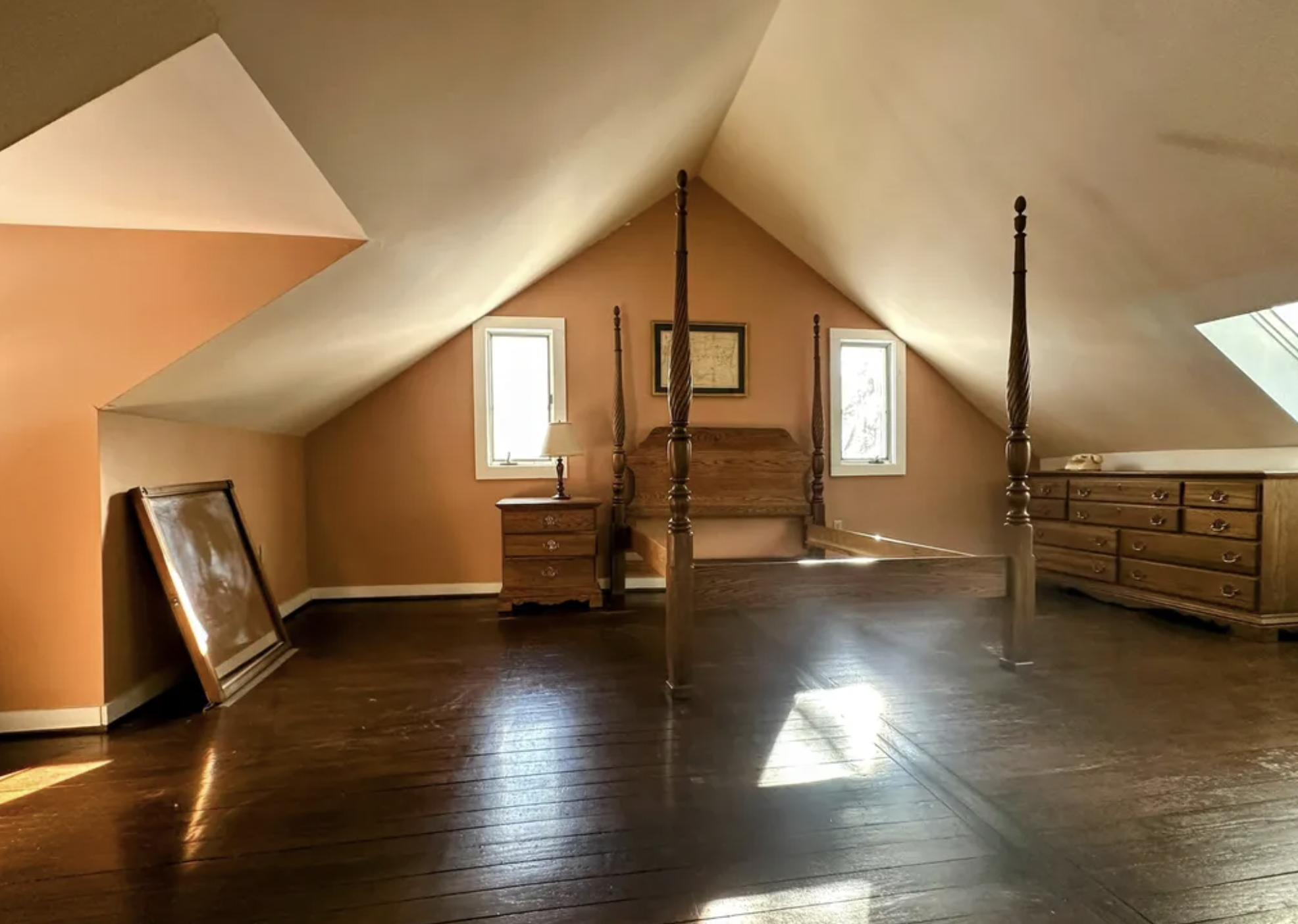 empty the room paint room farrow and ball dimity lighten the floors add a wood headboard the goes wall to wall under the windows with built in side tables