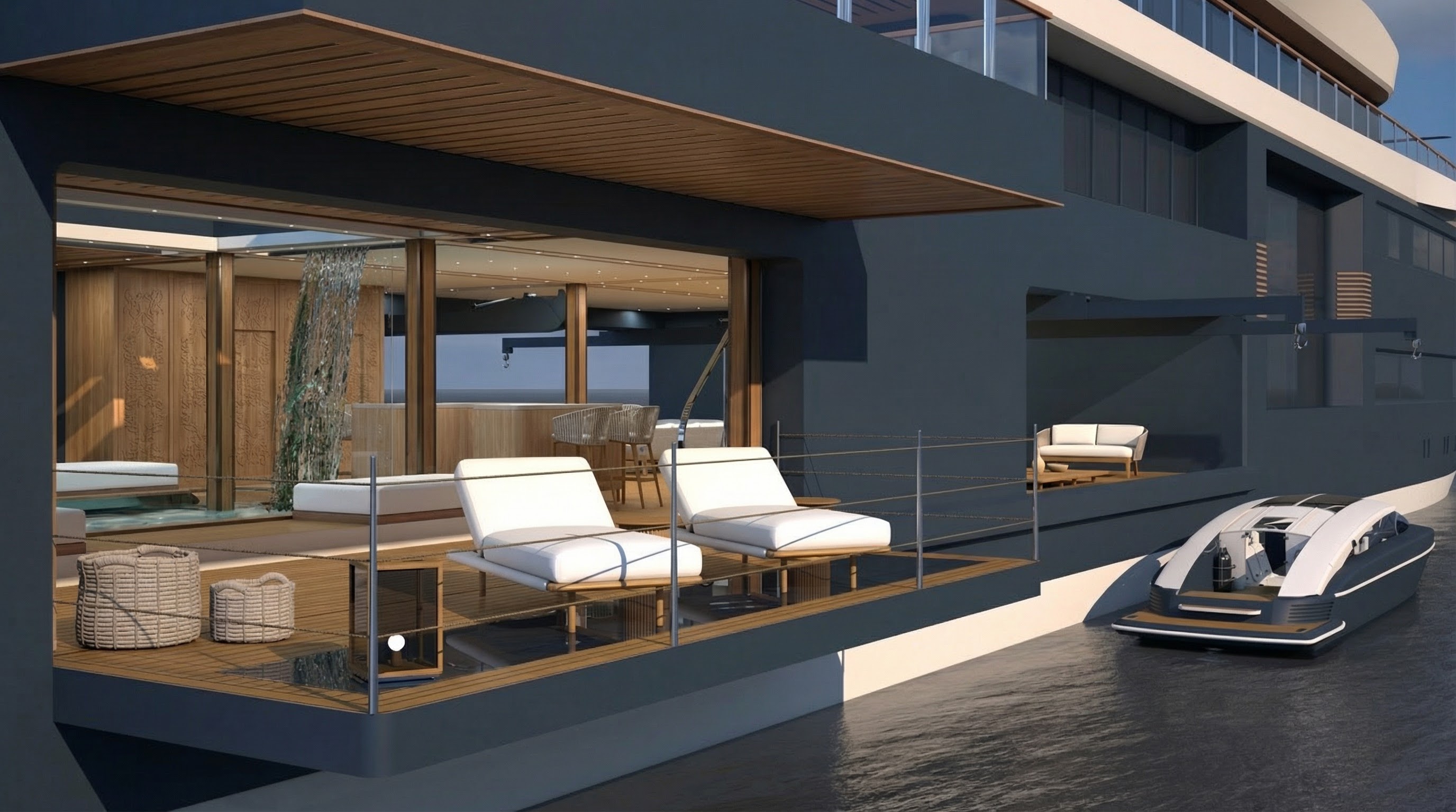 modify exclusively the white ceiling surface visible in the recessed exterior overhang area do not modify columns carved panels glazing fa ade deck flooring furniture cushions baskets water tender boat lighting fixtures shadows perspective camera position any other surface or material maintain all geometry exactly as it is replace only the white ceiling finish with a warm light wood tone identical to the light huanghuali wood used on the interior columns specifications match the exact hue warmth and brightness of the column wood natural fine wood grain visible linear grain direction aligned with the length of the ceiling panels matte to satin finish no gloss soft natural reflection no color shift toward yellow or orange no darkening preserve all recessed lighting positions and light temperature exactly as they are the result must feel seamless and cohesive with the column material maintaining high realism and material consistency all other elements must remain pixel identical