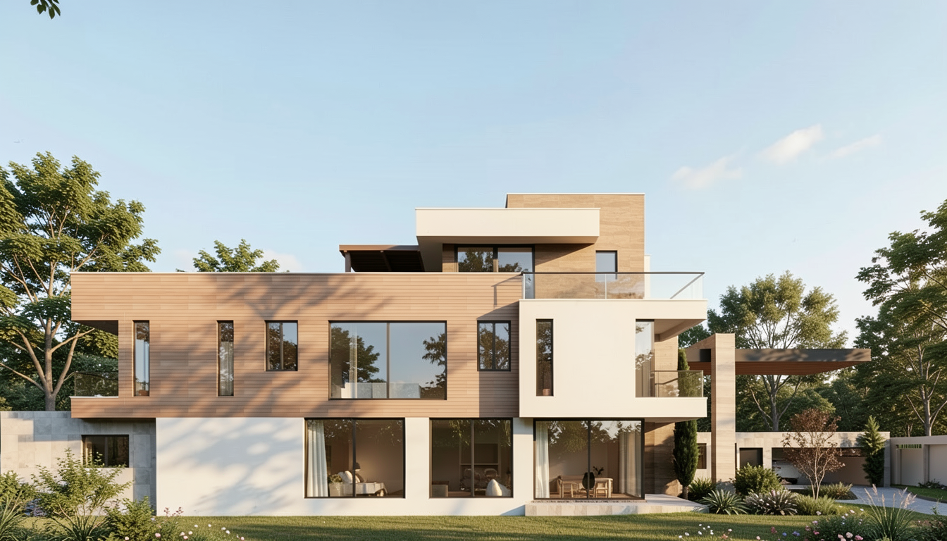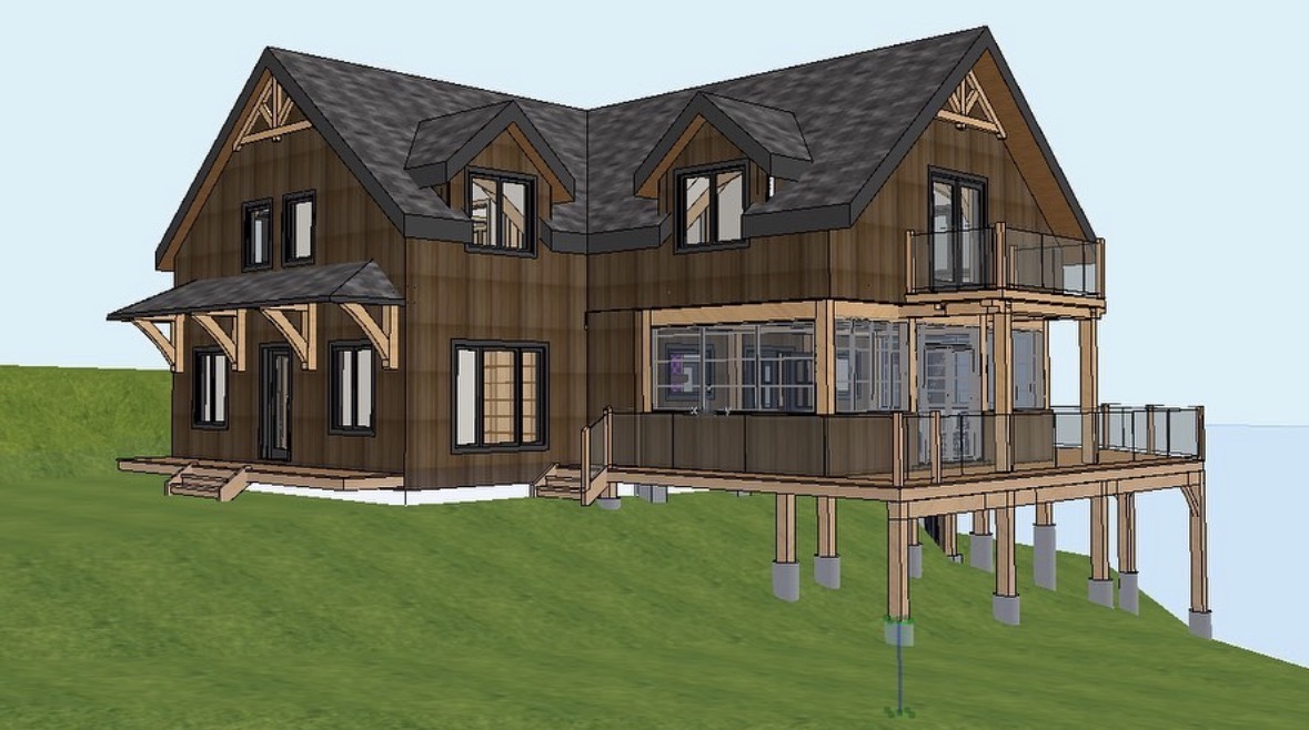 render a charming two story wooden house on a lush green hill the house features textured dark brown wood siding contrasting with dark gray shingles on the roof large windows and glass doors reflect a serene atmosphere the wraparound porch and balcony display warm natural wood tones accented by transparent glass railings the setting embodies a tranquil lakeside retreat under a clear blue sky with soft natural lighting that enhances the cozy and inviting atmosphere