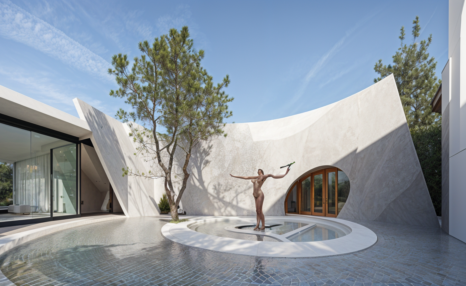 le corbusier exterior shot make it a building s roof with a woody and nature concept make it very abstract but make sense architecture