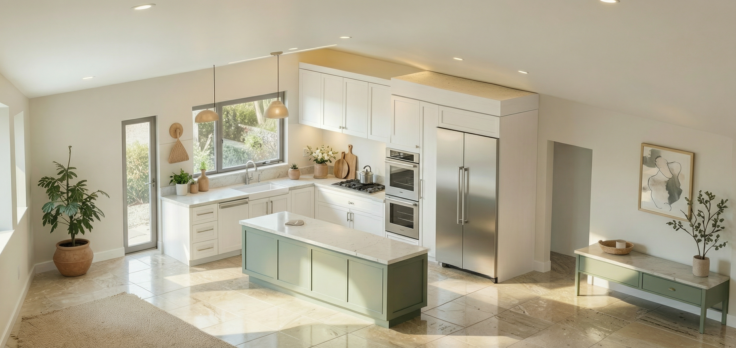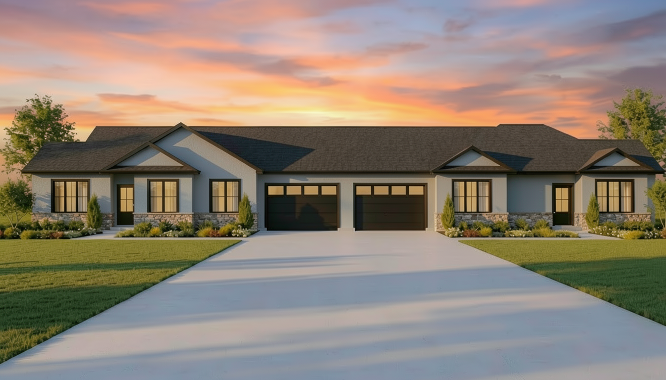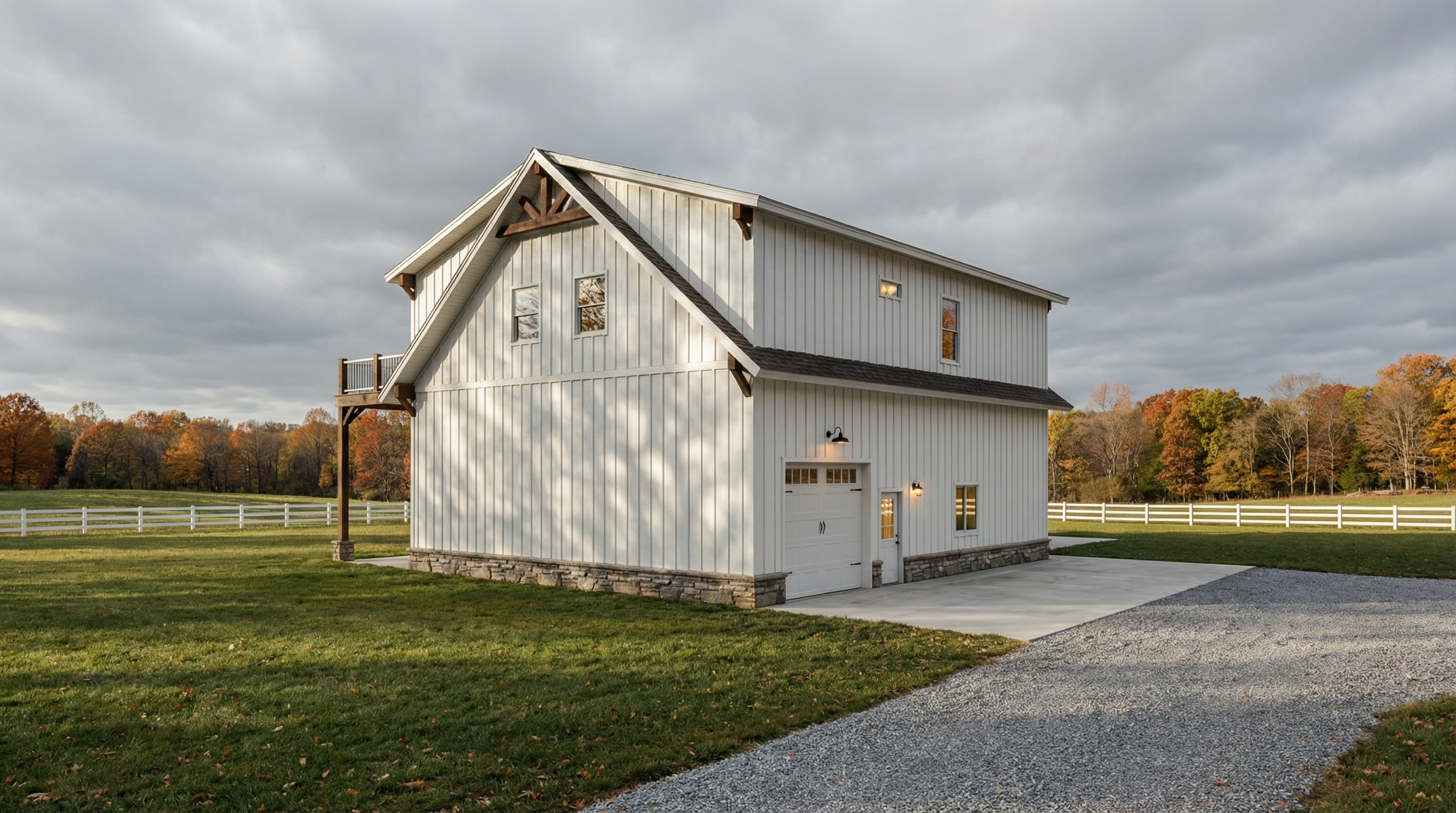 modern farmhouse with triple car garage is at 45 degrees to main house