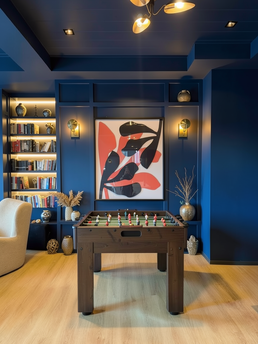 place foosball table underneath artwork add decorative objects and books at bookshelf only lighting at shelves to be soft warm lights do not change anything else