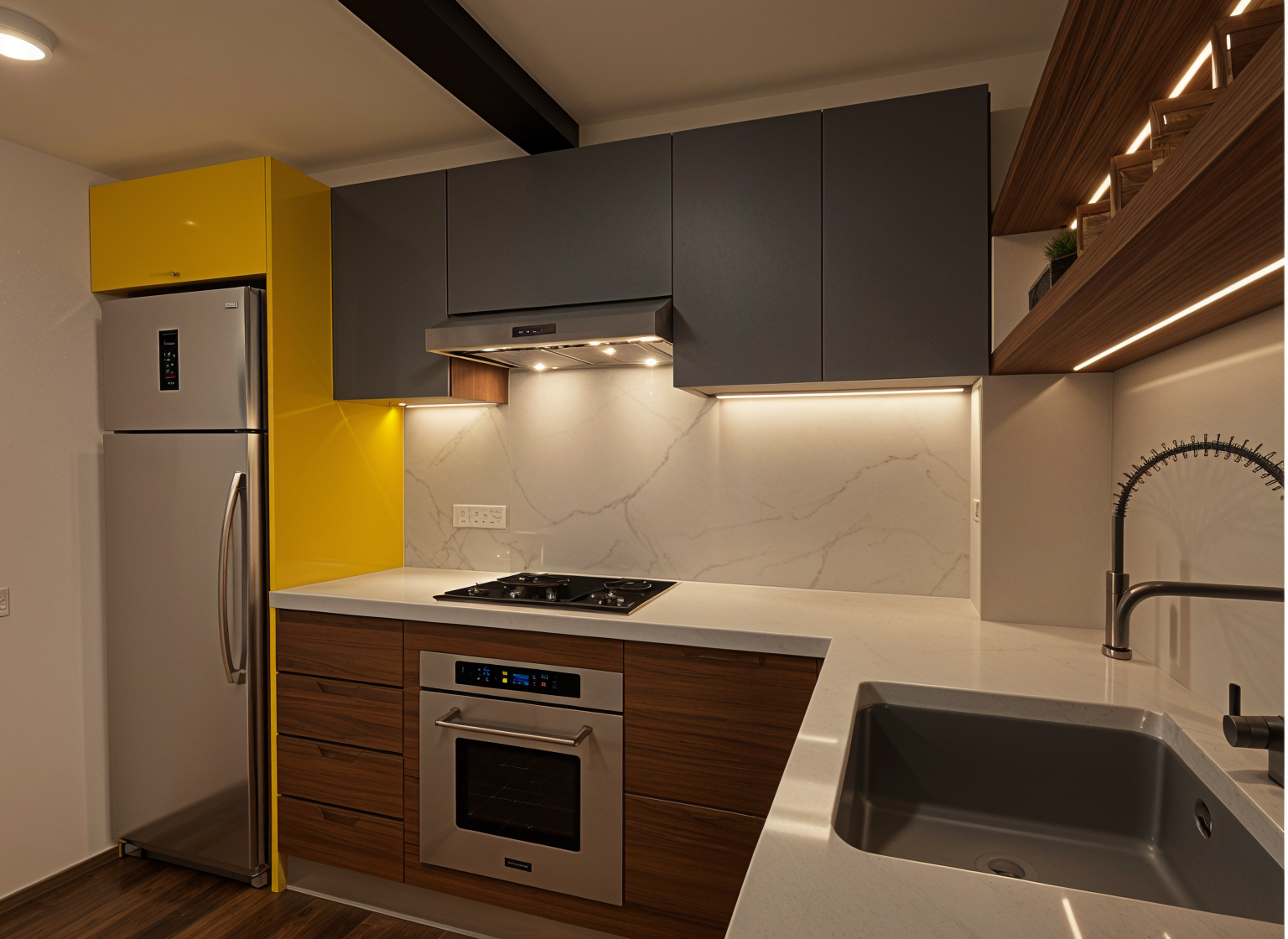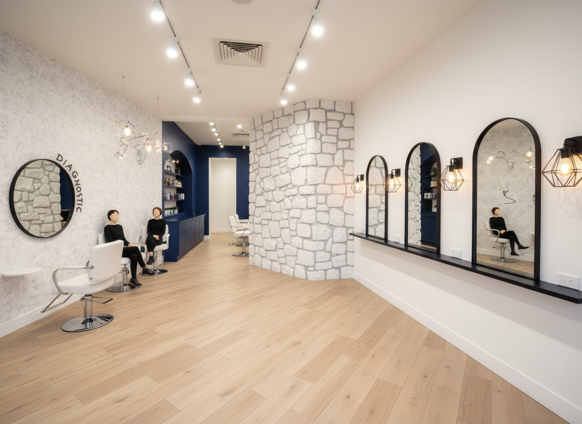 peux tu rajouter des fauteuil de coiffeur bleu fonc2 en face des miroirs de droites et mettre des shampoing l4oreal produit professionnel sur les petites console devant le mur de pierre