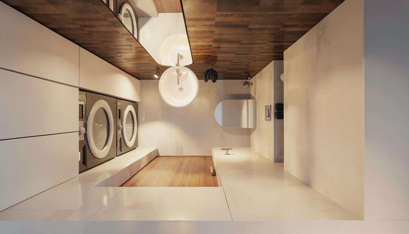 render a modern bathroom with a serene and soothing atmosphere the walls are adorned with light beige textured tiles the shower area features an elegant glass divider and the wall behind it is decorated with a soft pastel palm leaf pattern in shades of muted pink and taupe a lush green indoor plant adds a touch of nature standing in a sleek dark gray pot include minimalist concrete planters with small succulents the overall lighting is soft and warm enhancing the tranquil and inviting mood of the scene lighting bulb and mirror