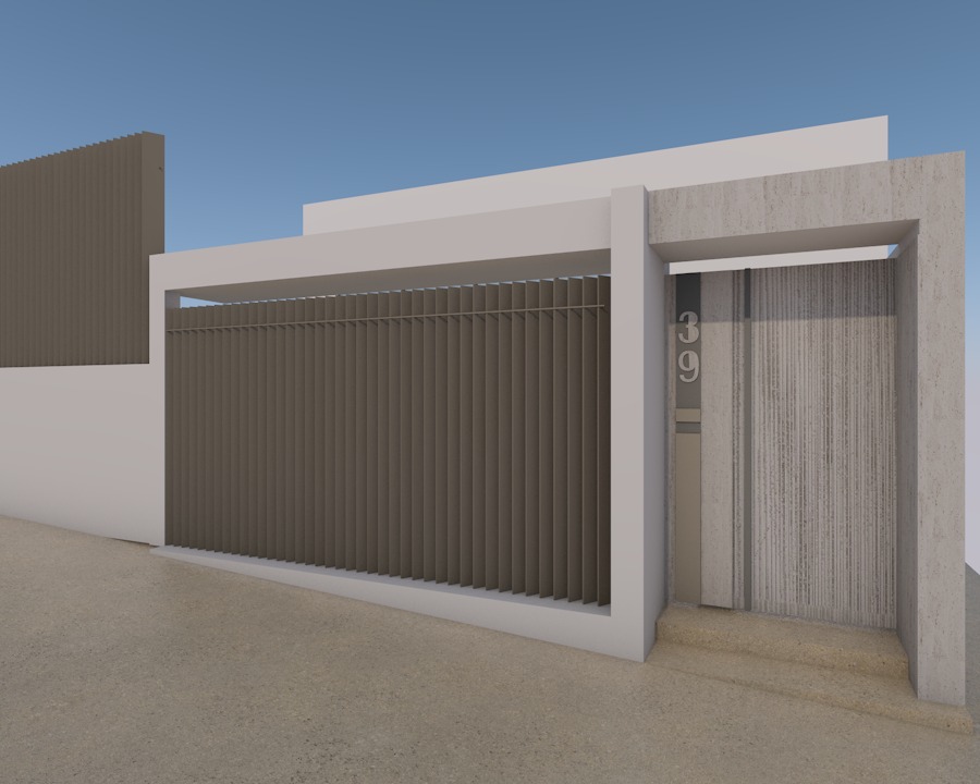 contemporary minimal fa ade with strong linear geometry and a refined material palette the entrance is with travertino and the door has striped lines adjacent to the entrance a vertical black metal element acts as a contrasting feature and visual anchor integrated within this surface the house numbers are expressed in a travertine finish appearing as perforated or inlaid elements creating a refined material contrast the boundary is formed by vertical metal slats in a light greige beige tone their rhythmic repetition creates a semi transparent screen that balances privacy and permeability while adding texture and movement to the fa ade the boundary is formed by vertical metal slats in a light greige beige tone modern and fresh