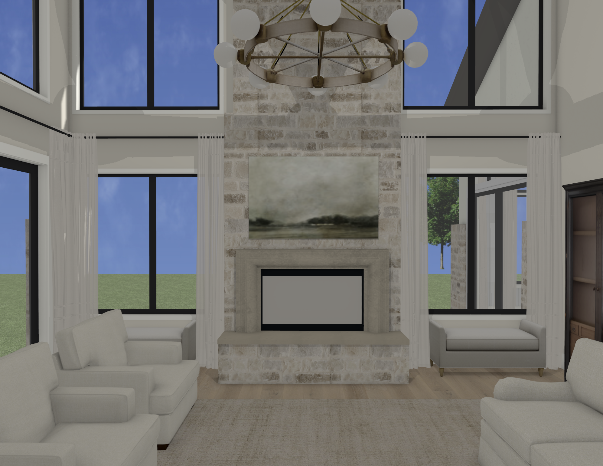 do not add anything to the rendering minimal background outside windows warm sunlight fire in fireplace