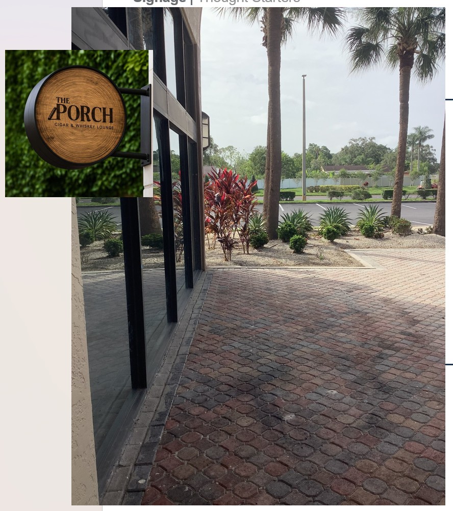exterior shot render this image with the sign shown attached to the exterior show the exterior wall with 2 black sliding doors show modern restoration hardware style outdoor furniture show outdoor heating lamps