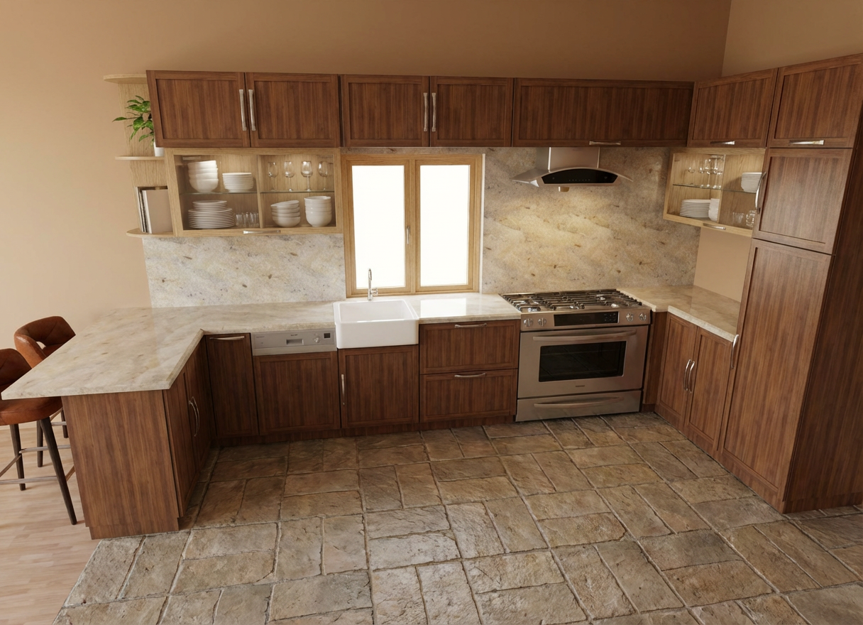 replace the stove and hood according to the new pictures trees are visible through the window everything else remains the same