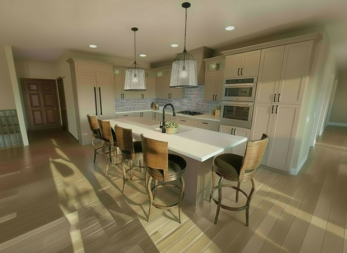 retain everything in this image except continue the wall that is behind the double ovens down until it is off screen