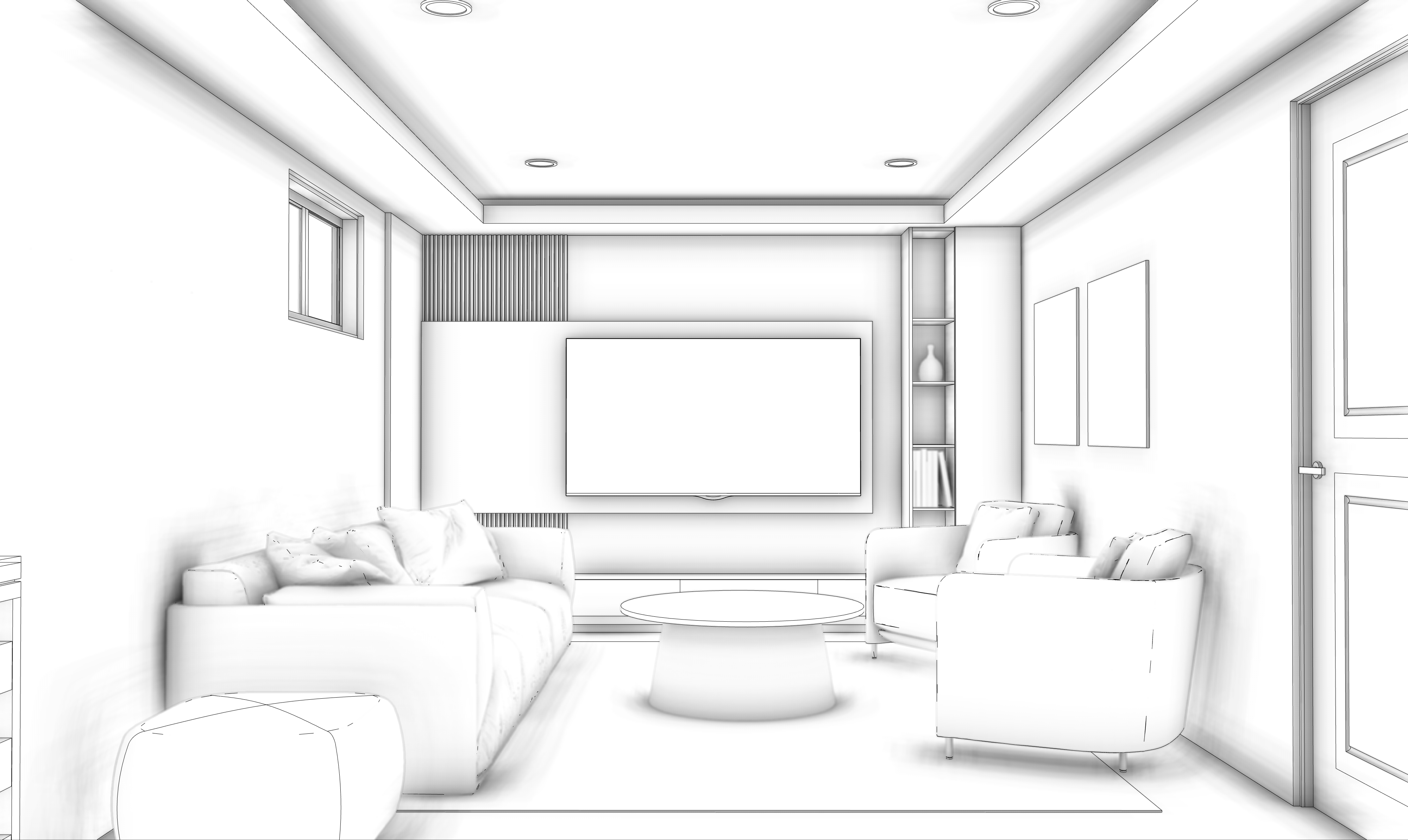 convert this image into a refined editorial style interior render of a modern basement living room designed for tv watching and social gatherings the design should feel contemporary and neutral avoiding overly masculine or feminine cues use warm almond tone wood flooring as the base of the palette incorporate soft neutral colors such as warm beige taupe light greige and natural textures include a comfortable modular sofa a low modern coffee table and subtle decor elements like books ceramics and soft textiles add a large textured area rug and layered cushions to create warmth lighting should feel cozy and atmospheric with recessed lights soft wall lighting and warm ambient glow typical of a well designed basement lounge the composition should feel balanced sophisticated minimal yet inviting like a high end interior design magazine photoshoot ultra realistic materials architectural visualization soft warm lighting high detail 4k interior render