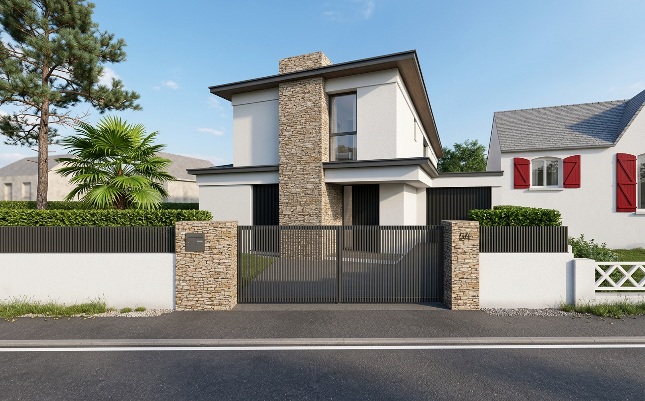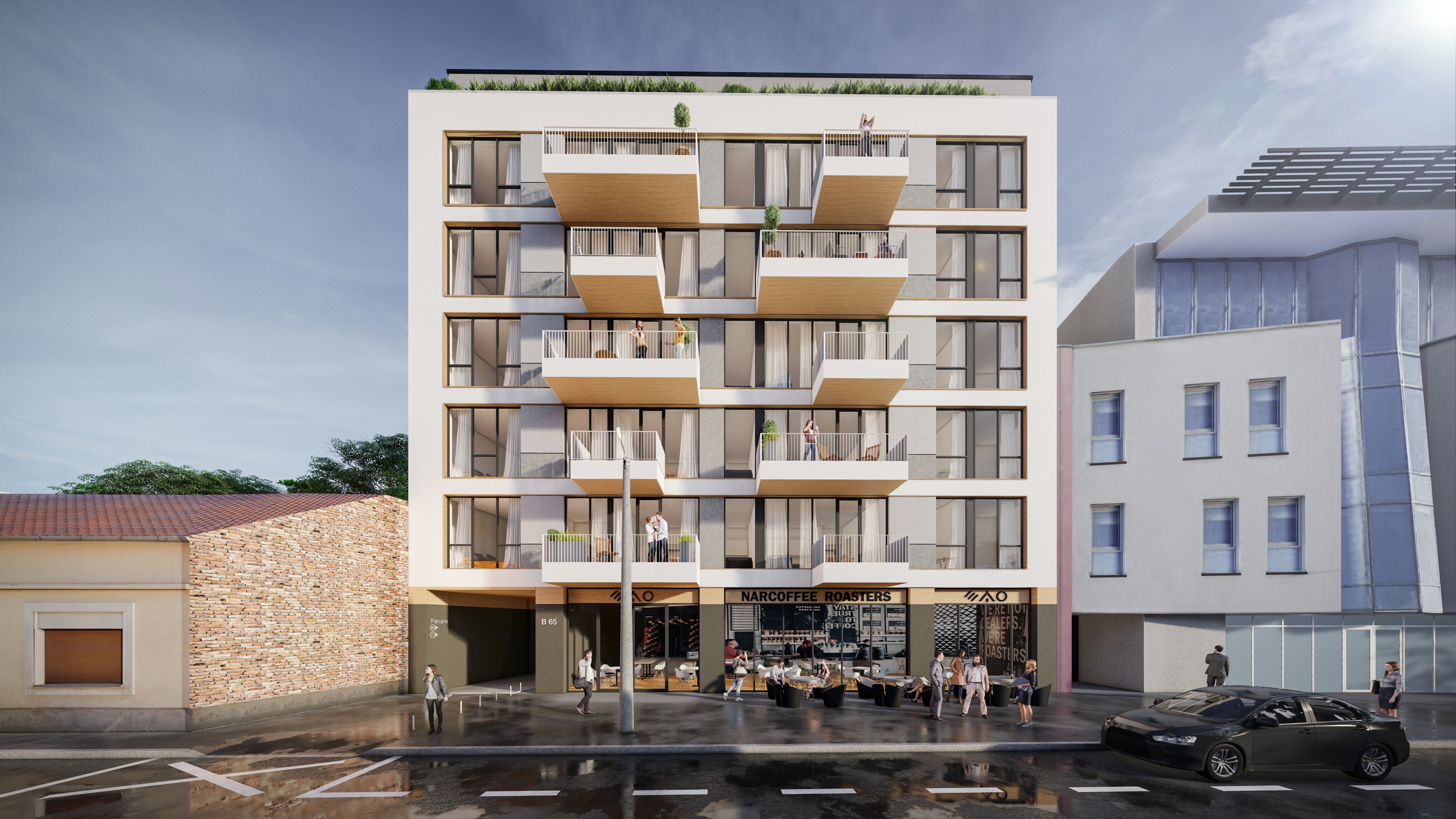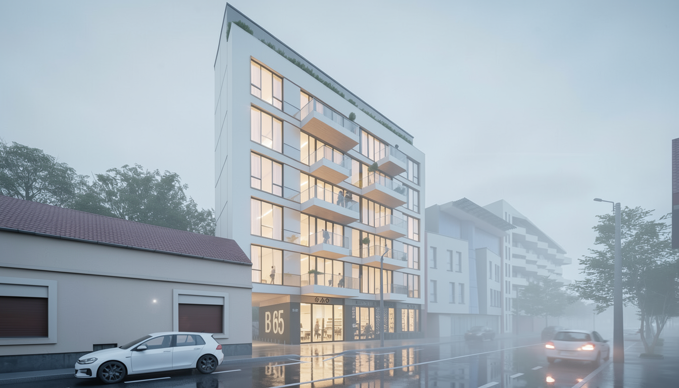important preserve the existing geometry and the existing context exactly as provided do not modify alter reinterpret add remove scale or reshape any geometry do not change the site surroundings street layout neighboring buildings vegetation or context elements do not modify geometry scale proportions buildings road layout sidewalks or surrounding context in any way do not change text photorealistic architectural rendering clean and balanced contrast calm cinematic mood style contemporary european residential architecture minimalist premium understated soft overcast noon atmosphere diffused cold natural daylight with subtle blue grey tones cinematic architectural mood warm interior lighting 3000k glowing from inside creating strong contrast between cool exterior and warm interior large glass surfaces with realistic reflections soft mirror effect subtle environmental reflections of sky and surroundings gentle fog diffusion in background high dynamic range lighting realistic global illumination soft shadows calm and minimalist nordic mood photorealistic architectural visualization balanced exposure no harsh highlights delete all people car with light on and motion blur people inside building keep the railing straight