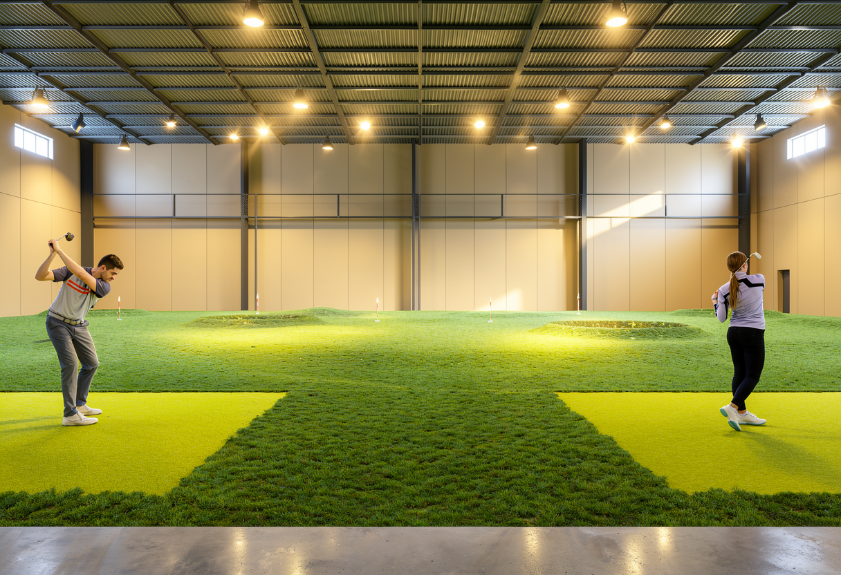 add a bucket of golf balls by each person a small bench and another person golfing in the middle