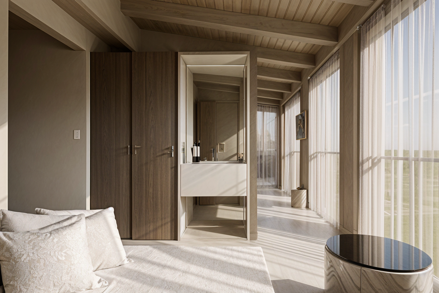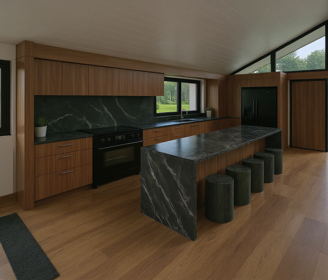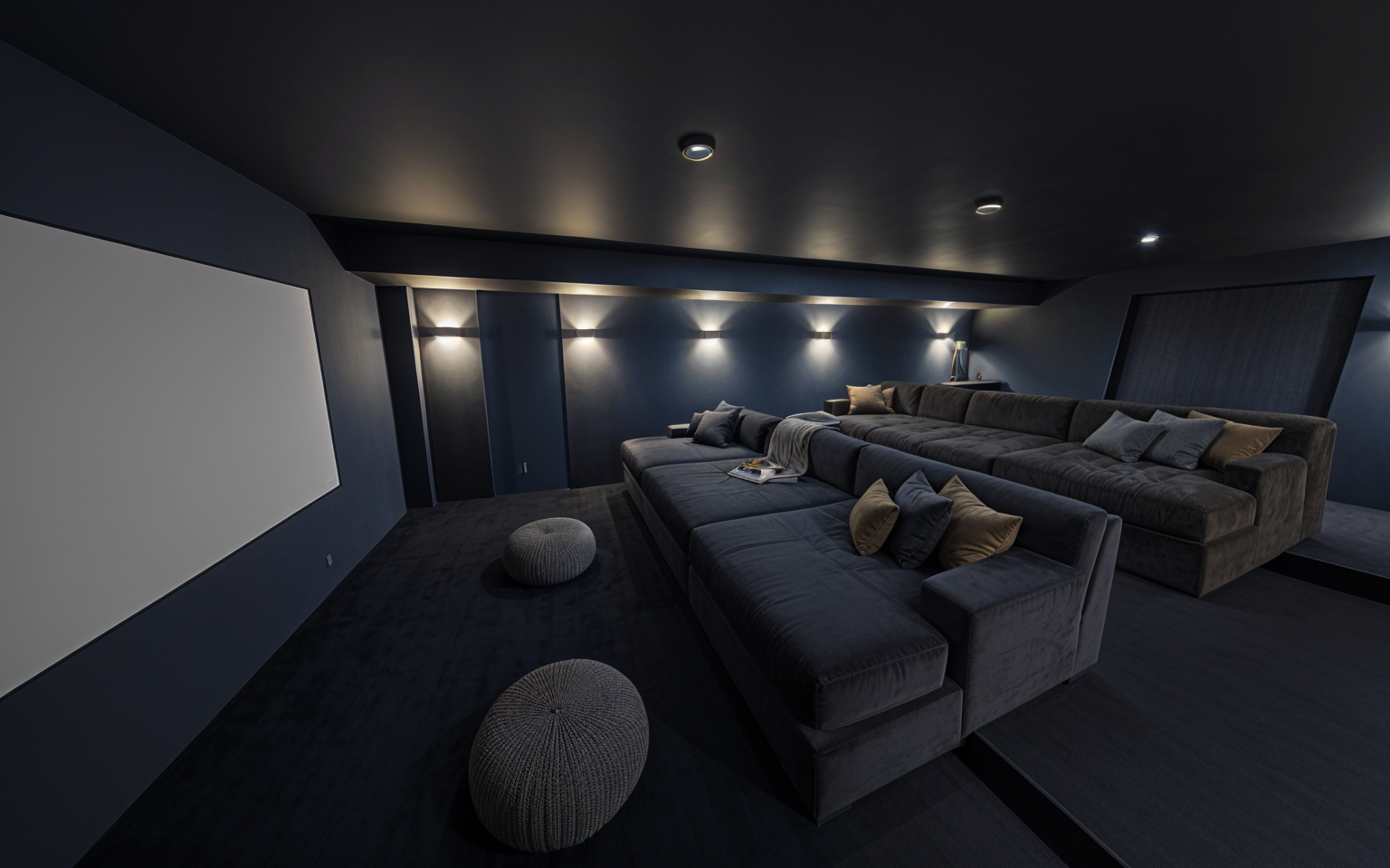 luxurious home theater lounge in deep navy blue tones matte midnight blue walls and ceiling with subtle sheen plush tiered modular seating in rich indigo and charcoal upholstery velvet and wool textures accent pillows in slate denim and muted gold low ambient wall sconces casting soft diffused light soft navy carpeted floor large projection screen cozy knit poufs in gray blue tones cinematic and intimate atmosphere sophisticated and moody lighting contemporary design with minimalist acoustic panels enveloping and tranquil ambiance photographed in architectural lighting style cinematic interior photography ultra realistic render