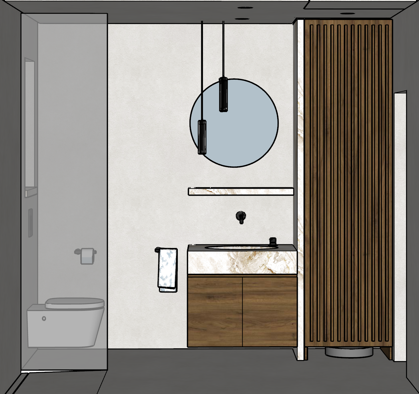 hyper realistic image minimalistic bathroom walls and floor from light white beige microcement washbasin from marble cabinet from natural oak veneer circular mirror black mat pendant lamps