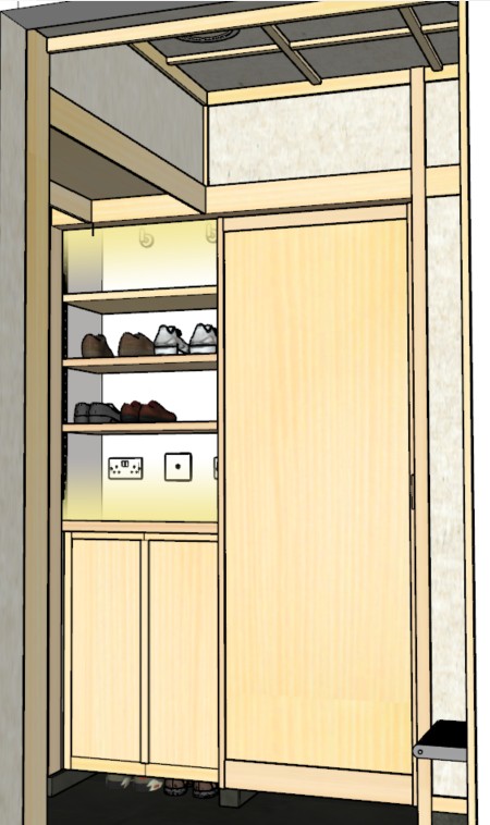 add ceiling light in the foyer and add those item on the shelf to shoes