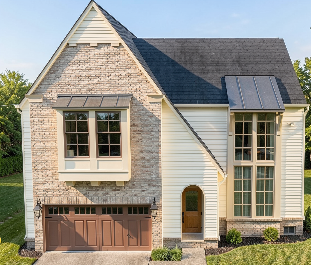 the brick is oyster bay white brick hardi siding is oyster white from sherwin williams the garage door is 887b67 window siding is hex code 887b67 keep brick consistent and keep colors consistent to photo copper lantern lights