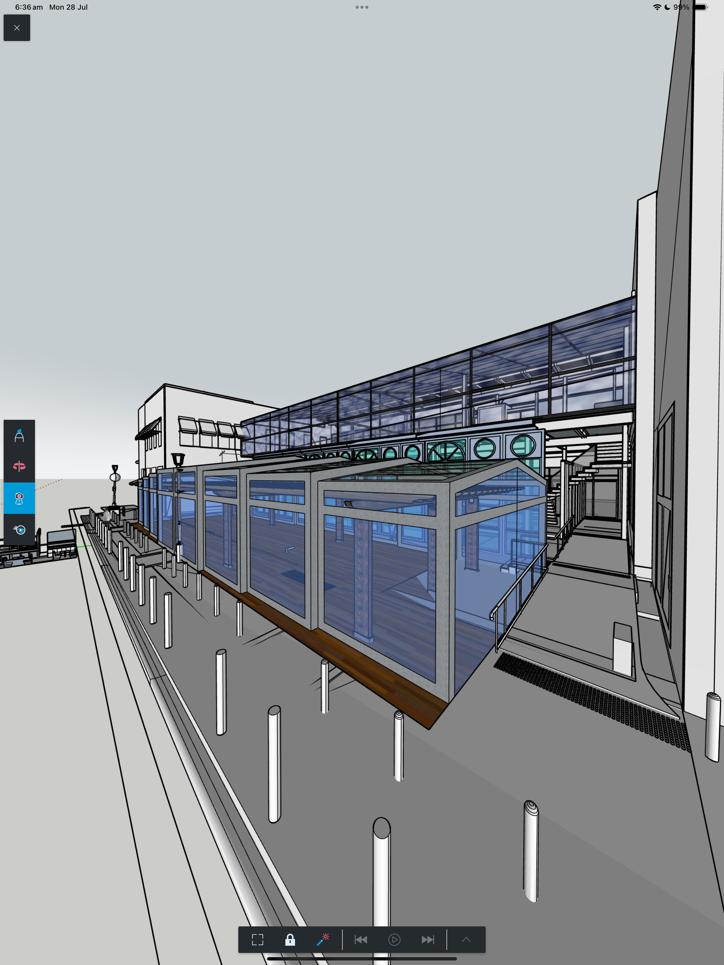 modernist exterior shot a modern architectural visualization of a sleek glass building the building has transparent blue tinted glass panels surrounded by steel gray frames the walkways and surroundings feature light gray concrete the ground beneath the glass structure is dark polished wood adding a warm contrast bright white cylindrical posts line the pathway creating a pathway toward the entrance the atmosphere is clear bright golden our with a soft diffused light enhancing the structure s modern aesthetic green pant boxes running everywhere around outside of the windows and upstairs the interior of the building is a restaurant the windows are black frame with a path sloping into the interior on the walkways lots of greenery lots of plants architecture