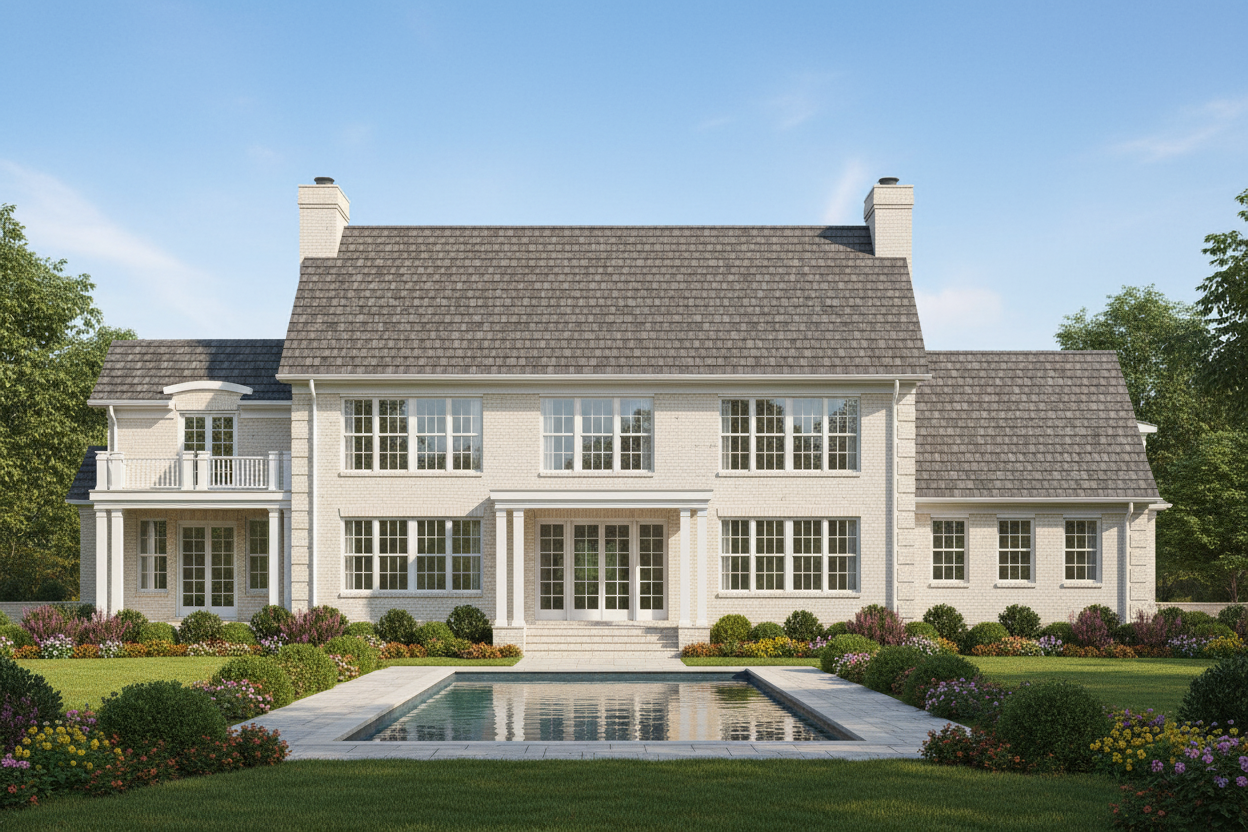 render a beautiful modern farmhouse with a welcoming atmosphere featuring a white facade with soft gray trimming the roof should be a slate gray with subtle texturing the windows have classic green shutters adding a pop of color the front yard is lush with greenery including vibrant pink flowerbeds lining the pathway which is a warm natural stone color the sky is a bright clear blue evoking a sense of peace and serenity
