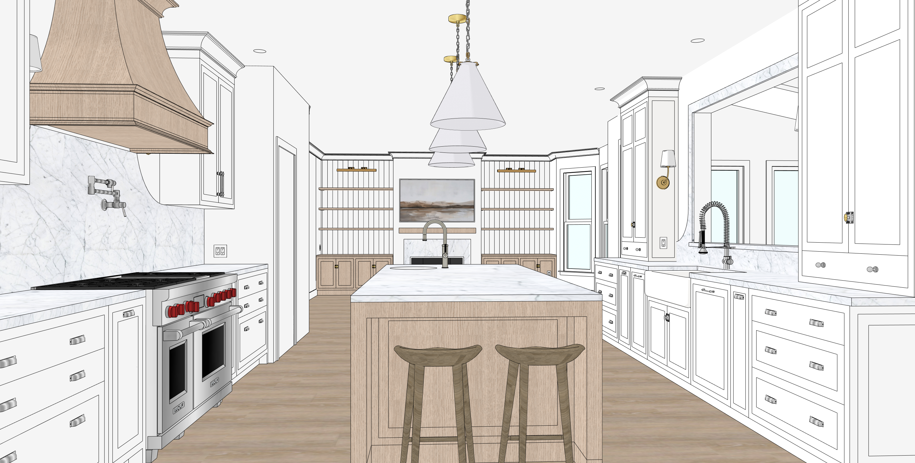 a beautifully rendered modern kitchen interior featuring white cabinetry with a light white oak island and range hoo the countertops and backsplash are made of pristine white marble with subtle gray veining the kitchen island is in the center topped with the same white marble surface the atmosphere is warm and inviting with soft natural lighting illuminating the space the stainless steel appliances are polished and modern complemented by brushed silver handles and fixtures the pendant lights above the island are sleek and contemporary with a soft white glow the hardwood floors have a light natural oak tone adding warmth to the room an elegant painting hangs on the far wall adding a touch of sophistication the overall vibe is airy and serene perfect for a contemporary home kitchen