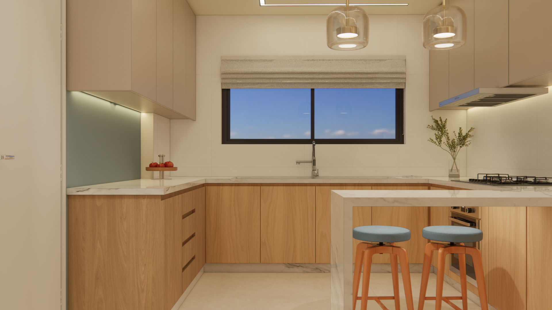transform this 3d into a hyperrealistic photograph the environment is bright light enters through the window on the right illuminating the entire scene set the simulation to the best camera and lens equipment for this architectural style photography shot 4k quality keep the tone of the right wall the other white walls are made of matte white porcelain tile the lower cabinets are made of light wood the upper cabinets are cappuccino colored the lower cabinets are light wood blue sky with some clouds