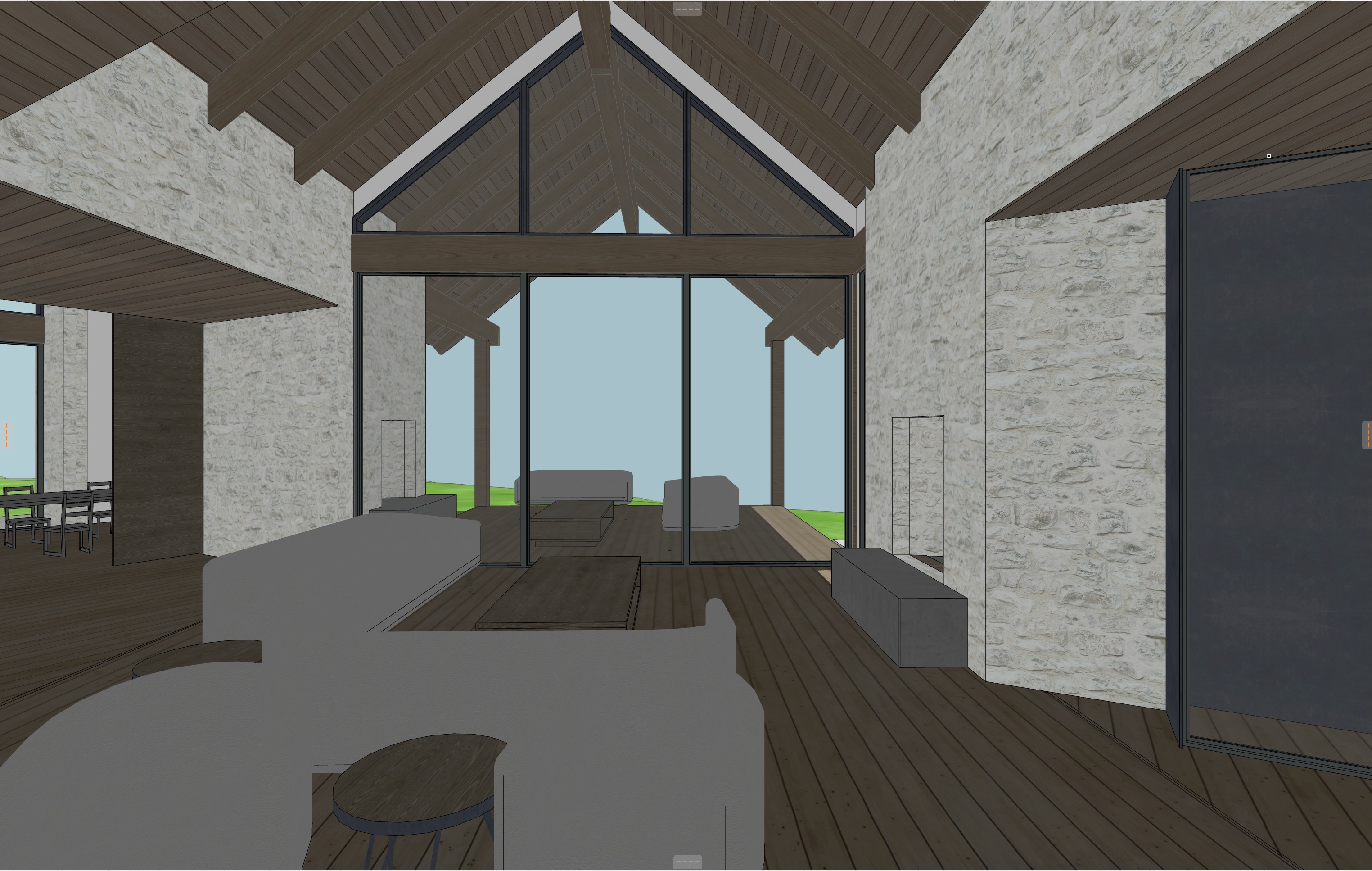 enhanced interior lighting wine display in case to the right flat white stone texture on walls