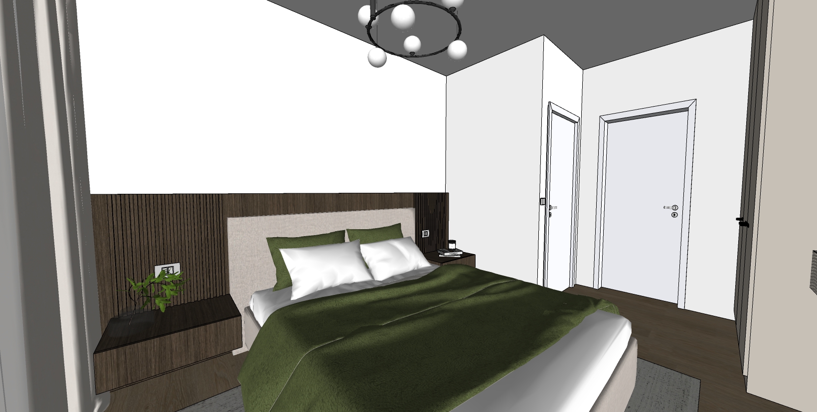 pereti albi tablie pat decor lemn atentie unde este riflaj in spatele tabliei din lemn este banda led atentie la covor print textura culoare dulapul este bej gri