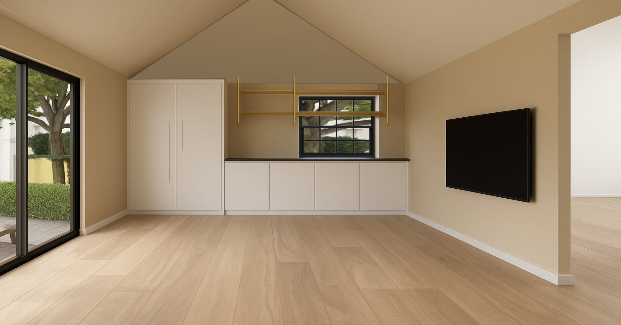 white oak wood floors cream cabinets and four way vaulted ceiling no stove vent and tv is the black rectangle on the right side wall architecture