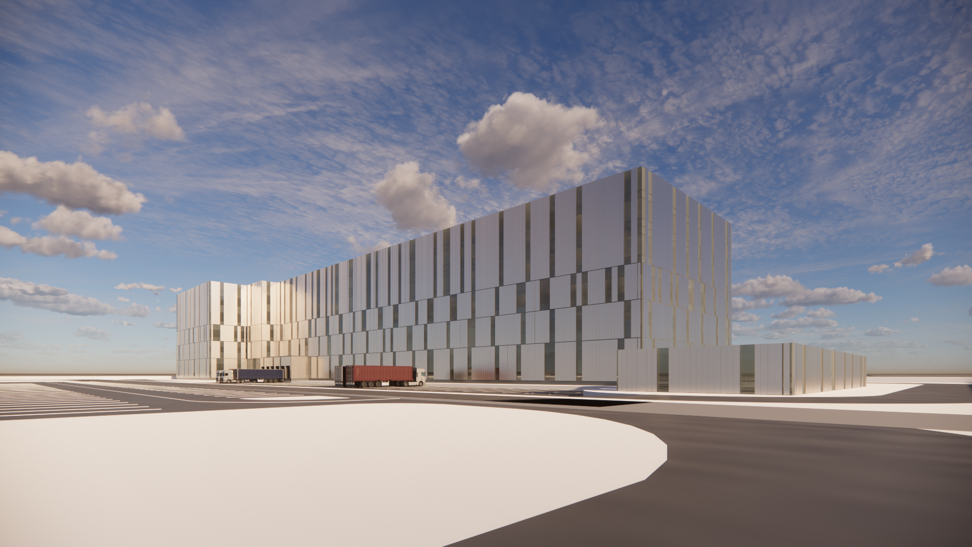 enhance this render of a modern industrial factory in abu dhabi kezad maintain the existing architecture and materials add realistic site enhancements including minimalist desert friendly landscaping gravel beds native shrubs low palms and planters along building edges and road medians subtle site lighting such as bollard lights and wall mounted led strips to emphasize building rhythm a few realistic people in scale staff walking near the building workers by loading docks and a few cars in the parking area add soft shadows natural reflections and warm sunlight late afternoon mood keep composition balanced clean and photorealistic with crisp details and high quality textures output in 4k 16 9 professional architectural visualization style architecture
