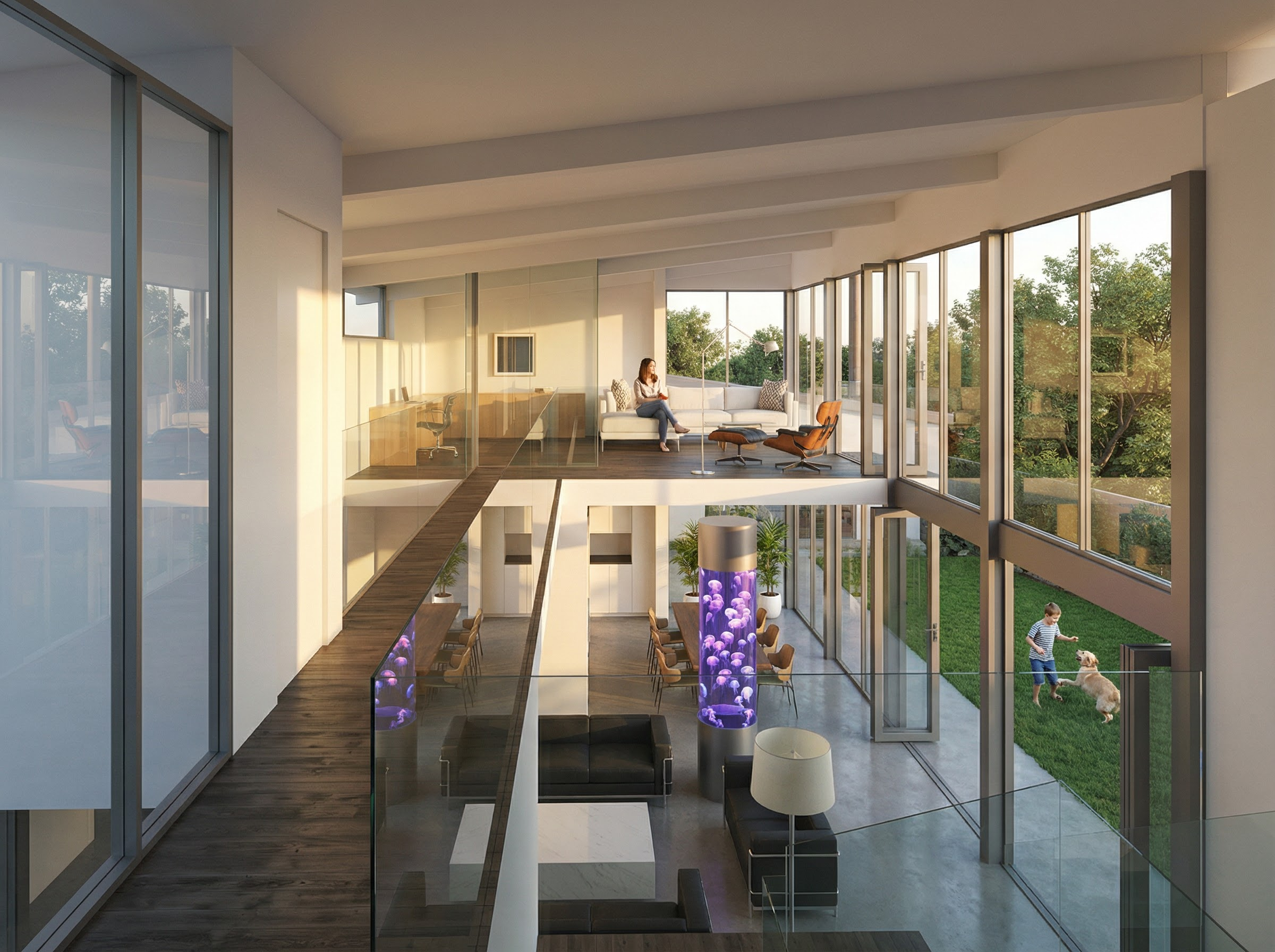 location is pacific palisades california late afternoon sunlight lighting in the space add grass in the yard outside add trees in the adjacent yards outside on the right side of the view add a woman sitting on the sofa the glazing mullions are anodized aluminum the glass on the left side of the view is to the outside at second floor the purple cylinder at the lower level is an acrylic glass jelly fish aquarium the interior walls are all white plaster add a boy playing with a dog in the yard outside make the jelly fish smaller in size and show more of them make the floor at the lower level below polished concrete add an area rug under the corbusier sofas in the living room below from design within reach dwr com