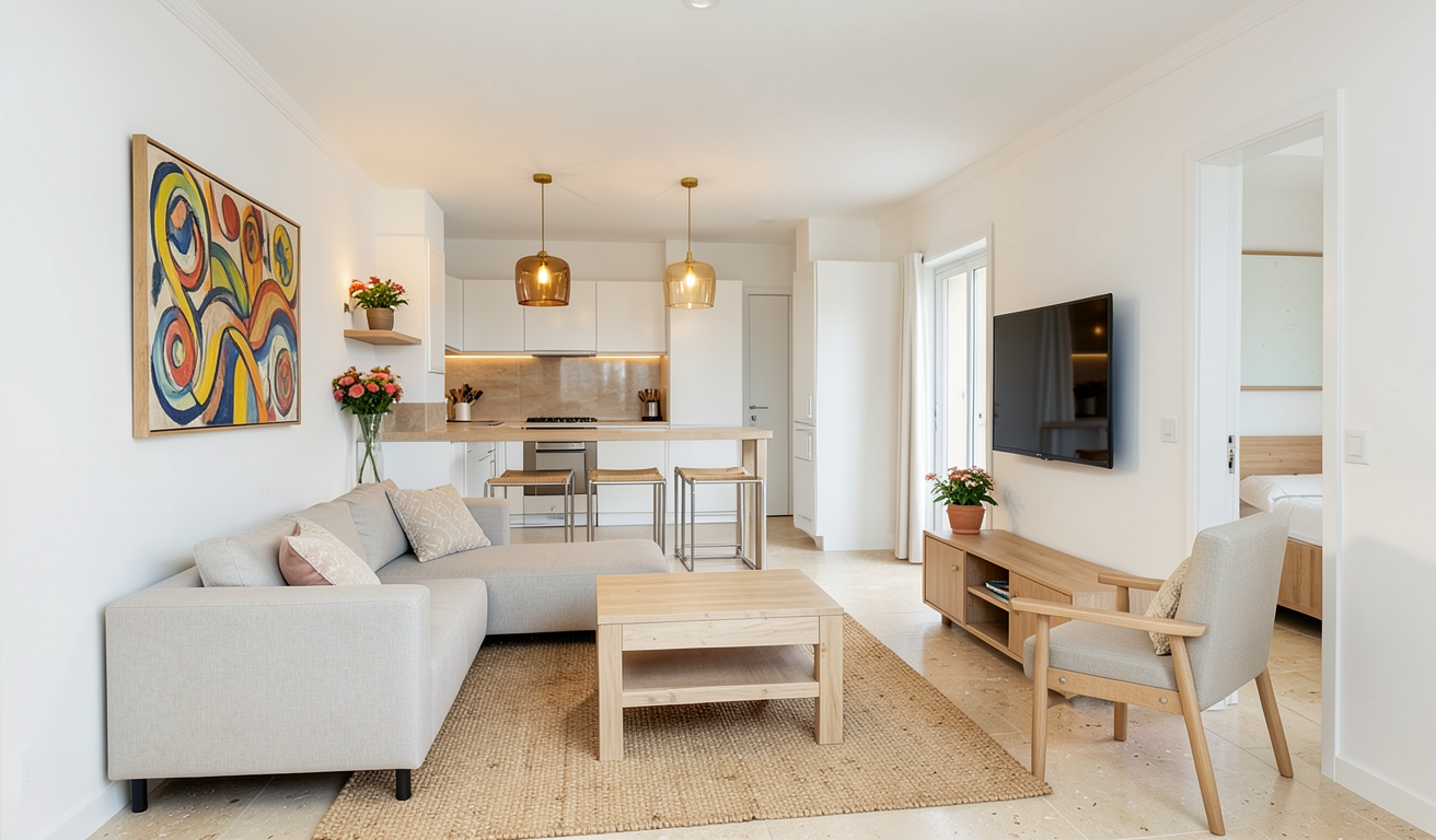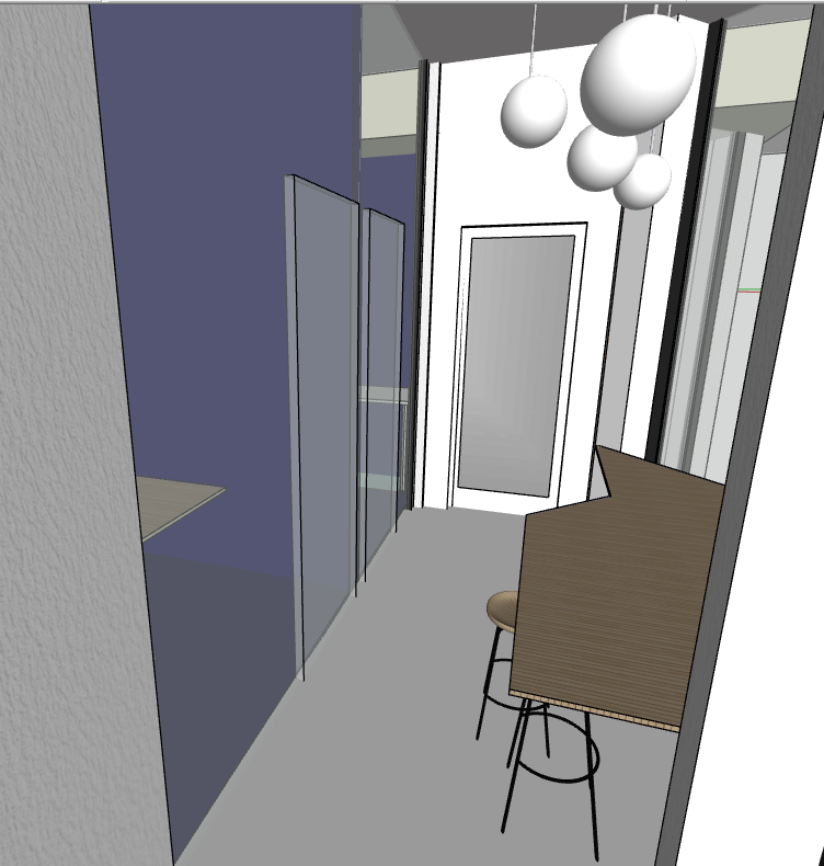 on the right there is table and windows in the center there is door that leads to bathroom and door has opaque glass