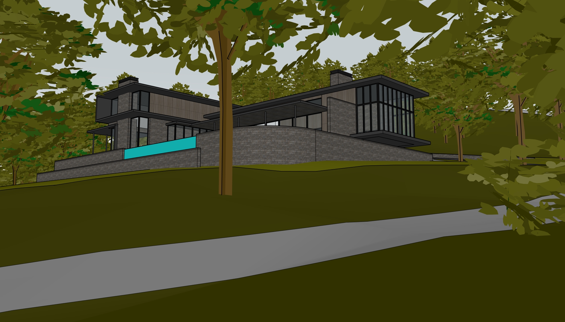 render this home on a hill in a wooded area the light blue in the image is a waterfall coming from a pool infinity edge do not add any objects the gray surface in the foreground is a driveway make the lighting and shadowing direction consistent