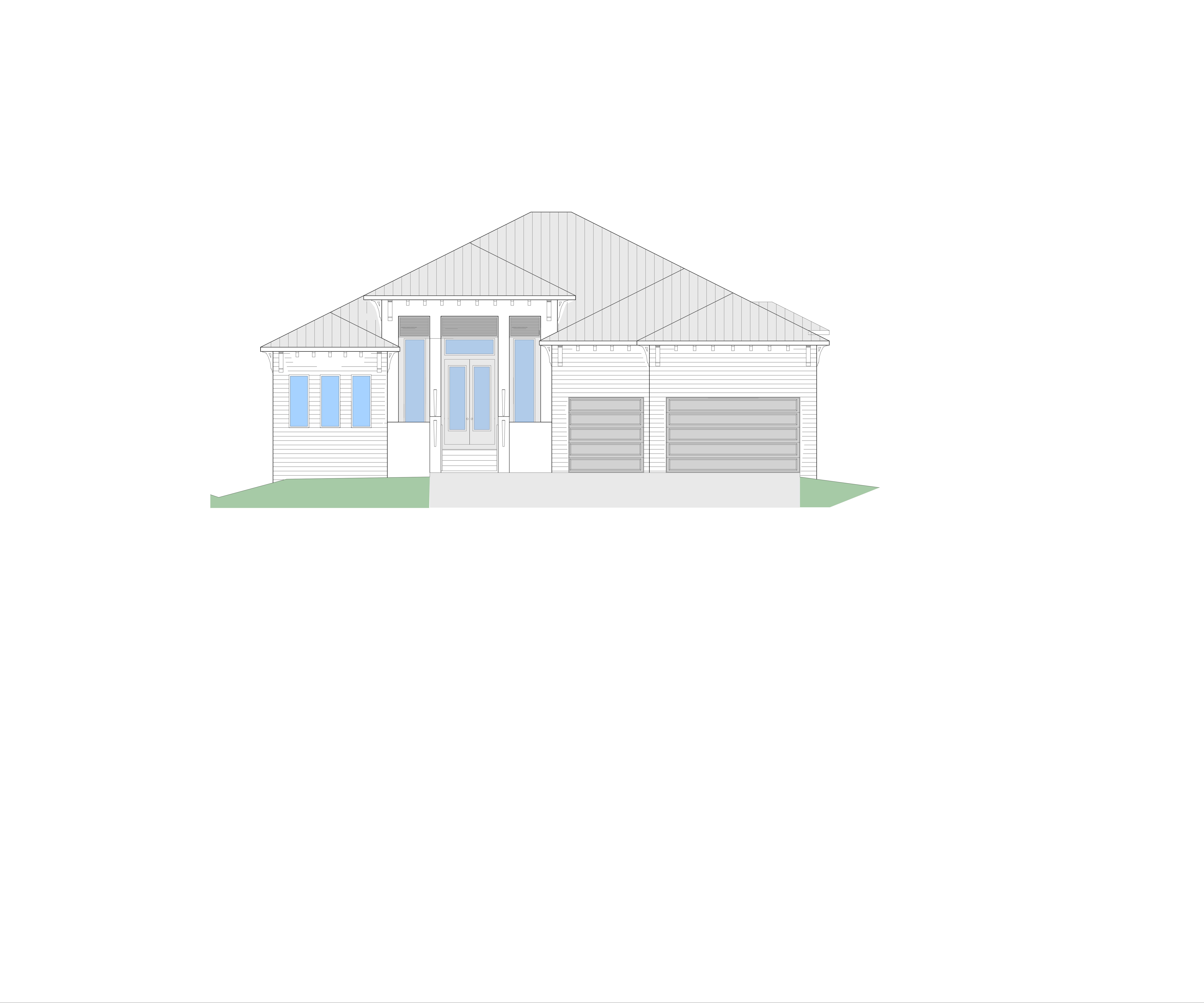 light gray metal roof light blue horizonal siding white stucco planter walls at the center of the house with dark blue bahama shutters over the 3 center openings in the middle of the house above the entry doors white corbels tropical landscaping with blue sky and clouds light gray dappled driveway and sidewalk to entry