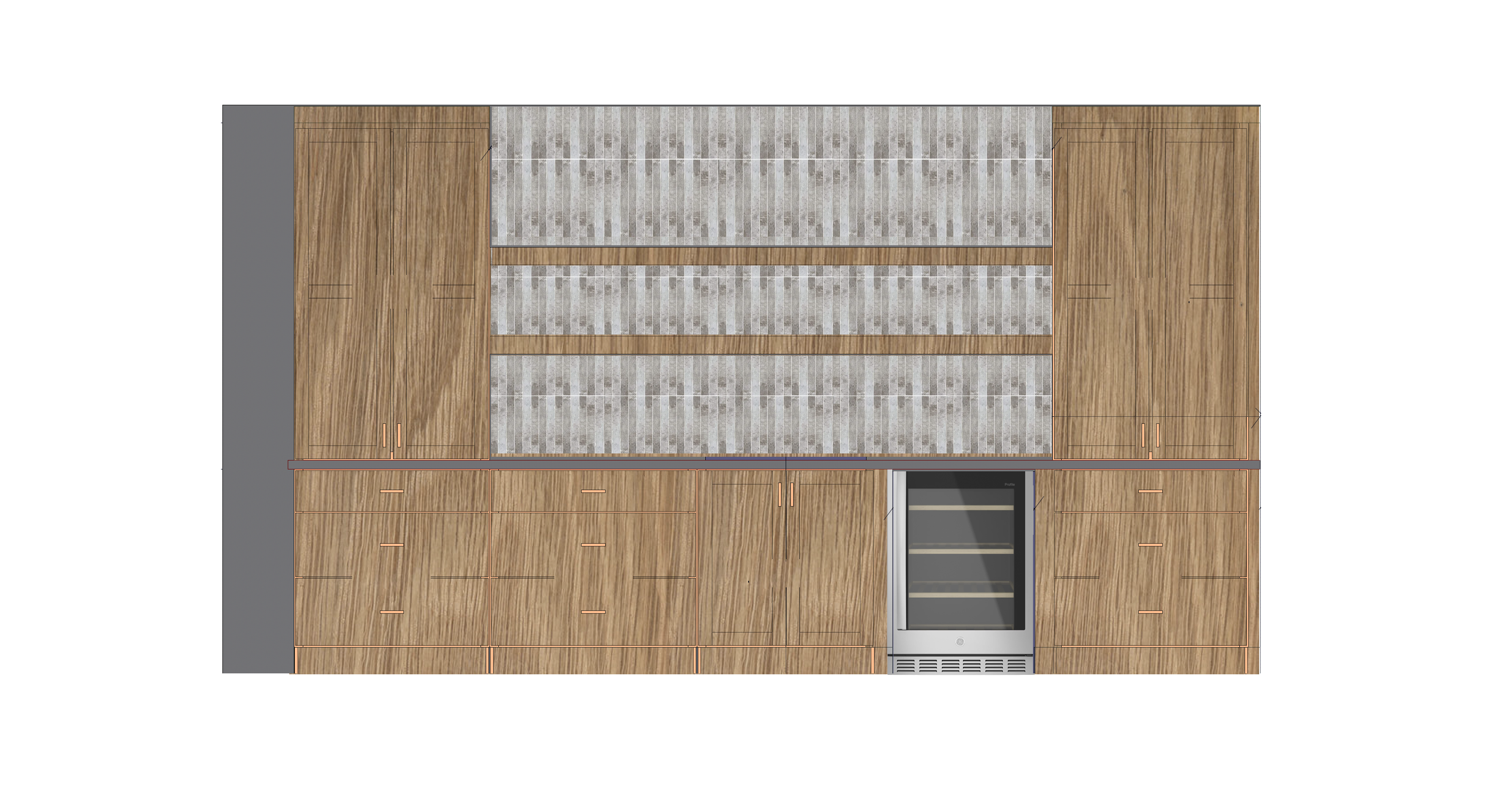warm white oak stained wet bar with a light stained white oak floating shelves marble countertops on a sunny day