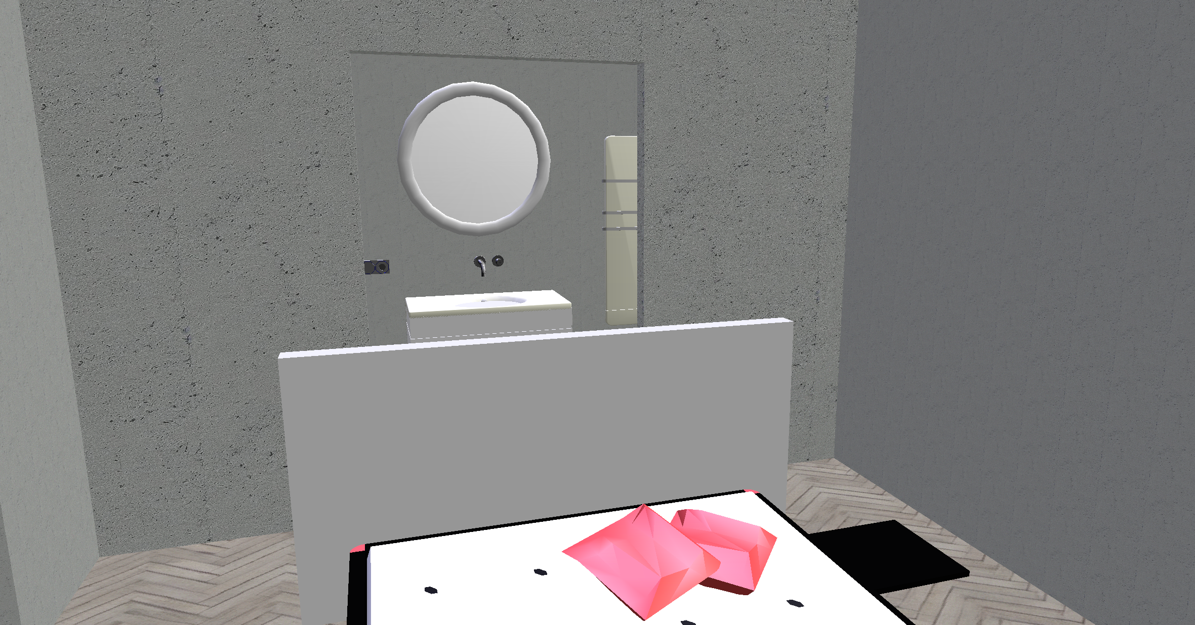 genau dieses rendering berarbeiten fotorealistisches innenraum foto exakt dieselbe perspektive und kameraposition wie das hochgeladene referenzbild 100 identische raumgeometrie exakt gleiche m belanordnung exakt gleiche verlegeart und richtung von parket und platten wie vorlage parket ruhig und hellgrau weiches nat rliches tageslicht raum k nstlich ausleuchten sanfte realistische schatten realistische materialien stoff mit leichten gebrauchsspuren hochwertige oberfl chenreflexionen lavabo komplett aus marmor collemandina grigio in braungrau dunkel lavabo innen ebenfalls collemandina im unterbau im obersten drittel eine griffmulde ber die ganze breite ganzer unterbau in collemandina unterbaum bel mit unterbaubeleuchtung dahinter eine gessi wandarmatur edelstahl vollkommen rahmenloser und hinterleuchteter spiegel mit echten spiegelungen links neben dem lavabo ist die dusche armatur ersetzen mit thermostatmodul axor select 460 90 mit stabhandbrause und grosser brause mit anschluss aus der wand alles in edelstahl geb rstet an der hinteren wand eine beleuchtete nische dellco in box luna in der gr sse 30x30cm mit led licht w nde in der dusche und boden collemandina grigio in braungrau alle sichtbaren w nde sind sichtbeton schwarze steckdose und schalter links vom lavabo auf gleicher h he wie die armaturen rechts vom lavabo handtuchradiator mit weissem badetuch schwarze runde deckenspots im bad und im zimmer im bad weisse um 15 cm abgeh ngte decke bett wie vorlage modern mit kopfteil aus beigem abgestepptem stoffbezug mittig im raum parket im zimmer ruhig und hellgrau boden im badbereich collemandina grigio in braungrau links vor der wand zum bad ein grau get ntes durchscheinendes glas zum schieben an grossen rollen aus edelstahl oben ber die ganze breite aufgeh ngt gr sse die dunklere fl che in der vorlage fassade aussen aus hellgrauem klinker sehr moderner minimalistischer look nat rliche farbwiedergabe golden hour feeling hell ausleuchten das bild muss wie eine professionelle fotografie aussehen es soll ein echtes und reales foto sein canon eos r5 35 mm festbrennweite f 2 8 hyperrealistisch dslr qualit t raw aufnahme 8k aufl sung extrem scharf perfekte tiefensch rfe professionelle architekturfotografie