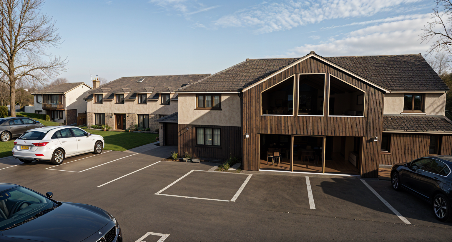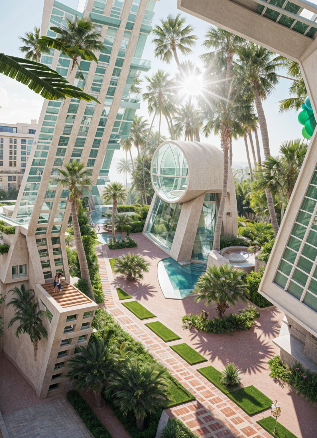 outdoor view shopping center sand stone facade palm trees green roof cafee on the roof architecture