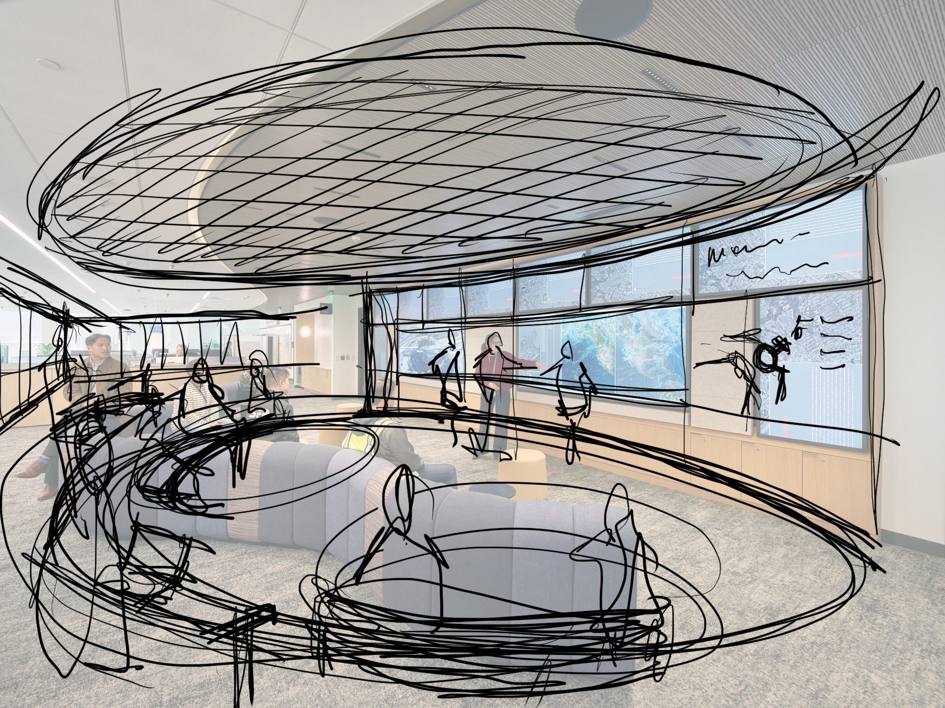 modern interior shot transform this freehand interior architectural sketch into a high end photorealistic architectural visualization of a contemporary corporate interior space for united airlines at san francisco international airport incorporating elements of a strategic operations center critical interpret the sketch faithfully while preserving the intended spatial layout proportions and perspective maintain the original camera viewpoint and composition implied by the sketch do not redesign the architecture refine and resolve it into a buildable realistic environment straighten and clarify geometry where needed but do not alter design intent program identity space type premium airline lounge corporate workplace integrated operations environment reflect united airlines brand identity in a subtle sophisticated way not overt branding integrate aviation inspired design cues precision movement clarity efficiency convey a calm premium travel and operations experience aligned with sfo s focus on wellness and performance materials light oak or warm engineered wood flooring matte neutral soft wall finishes off white warm gray microcement accents in united palette deep navy muted blue brushed aluminum stone elements limestone or light terrazzo durable high performance commercial grade materials suitable for airport environments lighting soft diffused daylight suggesting terminal glazing or perimeter exposure warm integrated lighting 3000k in ceilings coves and millwork even glare free illumination suitable for screen based environments subtle contrast no harsh shadows furniture modern high end lounge and workplace furniture modular seating clusters integrated workstations and touchdown desks ergonomic lounge chairs and banquettes materials leather wool high performance textiles in neutral tones with blue accents furniture layout should align with the sketched intent and spatial zones strategic operations screens key feature all digital screens display coordinated high resolution operational content content is consistent across all screens forming a unified system not random or decorative screen content includes real time flight data dashboards route network maps with animated connections weather overlays and air traffic flow diagrams operational metrics on time performance gate status fleet movement graphics are clean minimal and data driven dark or neutral backgrounds with light text and subtle blue accents typography is modern legible and consistent across all displays avoid clutter advertisements or unrelated imagery screens feel integrated into architecture not floating or dominant content should evoke a high performance airline operations command center all screen content must be custom aviation specific and visually consistent as a unified system not generic ui or placeholder graphics detailing resolve sketch into realistic architectural details clean edges aligned joints and buildable connections refined millwork and integrated systems integrated technology discreet screens embedded displays minimal visible hardware subtle wayfinding or graphic overlays aligned with aviation logic minimal accessories highly curated environment exterior glimpses suggest airport context tarmac aircraft tails soft sky runway lighting exterior remains soft and secondary to interior render style photorealistic architectural visualization in the style of dbox mir luxigon cinematic but restrained editorial quality slight atmospheric depth realistic reflections no over processing mood calm precise high performance sophisticated balance between hospitality lounge comfort and operational intelligence avoid overly commercial overly branded or chaotic visual noise output ultra realistic competition level architectural rendering suitable for executive presentation architecture