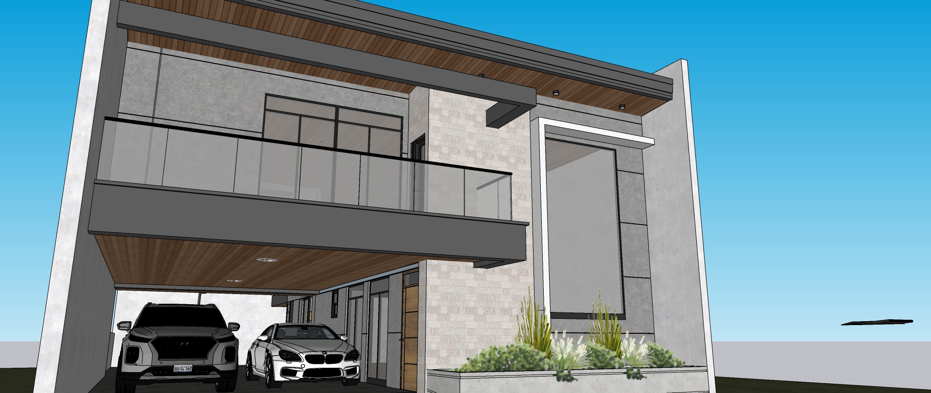 render this as minimalist design with natural stone cladding on the facade