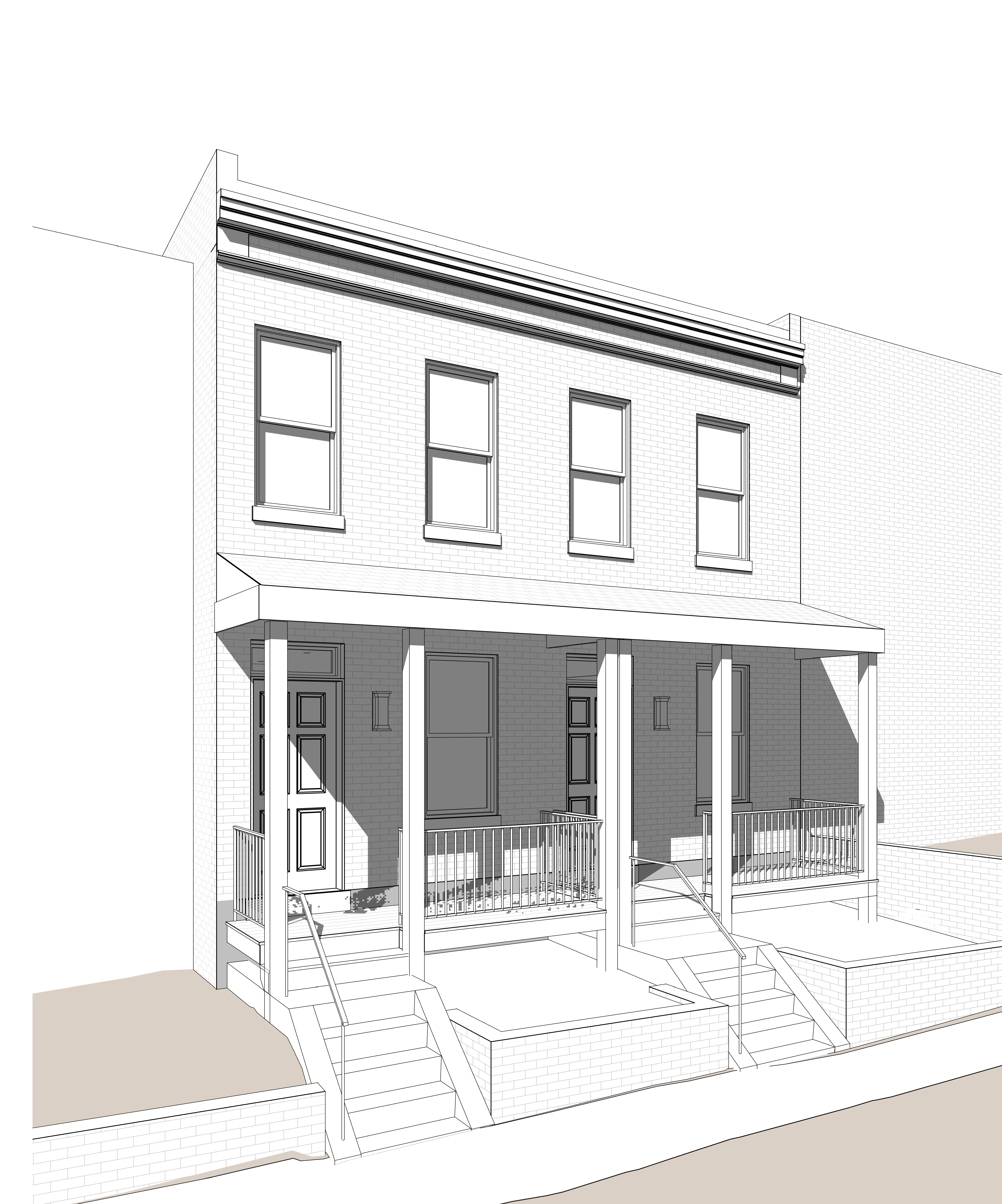 white brick house with white painted porch wood deck and concrete steps to sidewalk windows have black frames black doors and white railings soft shadows photo realistic meighboring walls are brick