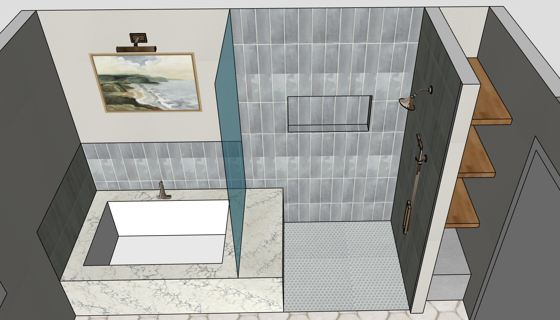 an ultra realistic professional interior photography render of a luxury master bathroom with a serene zen and oceanic aesthetic the large shower with glass doors is encased in oceanic tiles that continue around the bathtub the tub is an undermount tub within beautiful stone that continues into the shower as a bench above the tub is hanging art with an accent library light above offering a soft glow there is a shower niche that holds soap bottles there is an open linen closet behind the shower to hold rolled up towels a window on the other side of the room allows natural daylight to pour in casting soft realistic shadows and subtle light gradients across the room the lighting feels calm and organic like early morning coastal light the overall atmosphere is peaceful spa like and uncluttered evoking a luxury coastal retreat shot with a professional full frame dslr camera 35mm lens shallow depth of field ultra high resolution sharp focus realistic reflections accurate material rendering and true to life color grading hyper detailed cinematic realism natural imperfections global illumination ray traced lighting editorial interior photography style