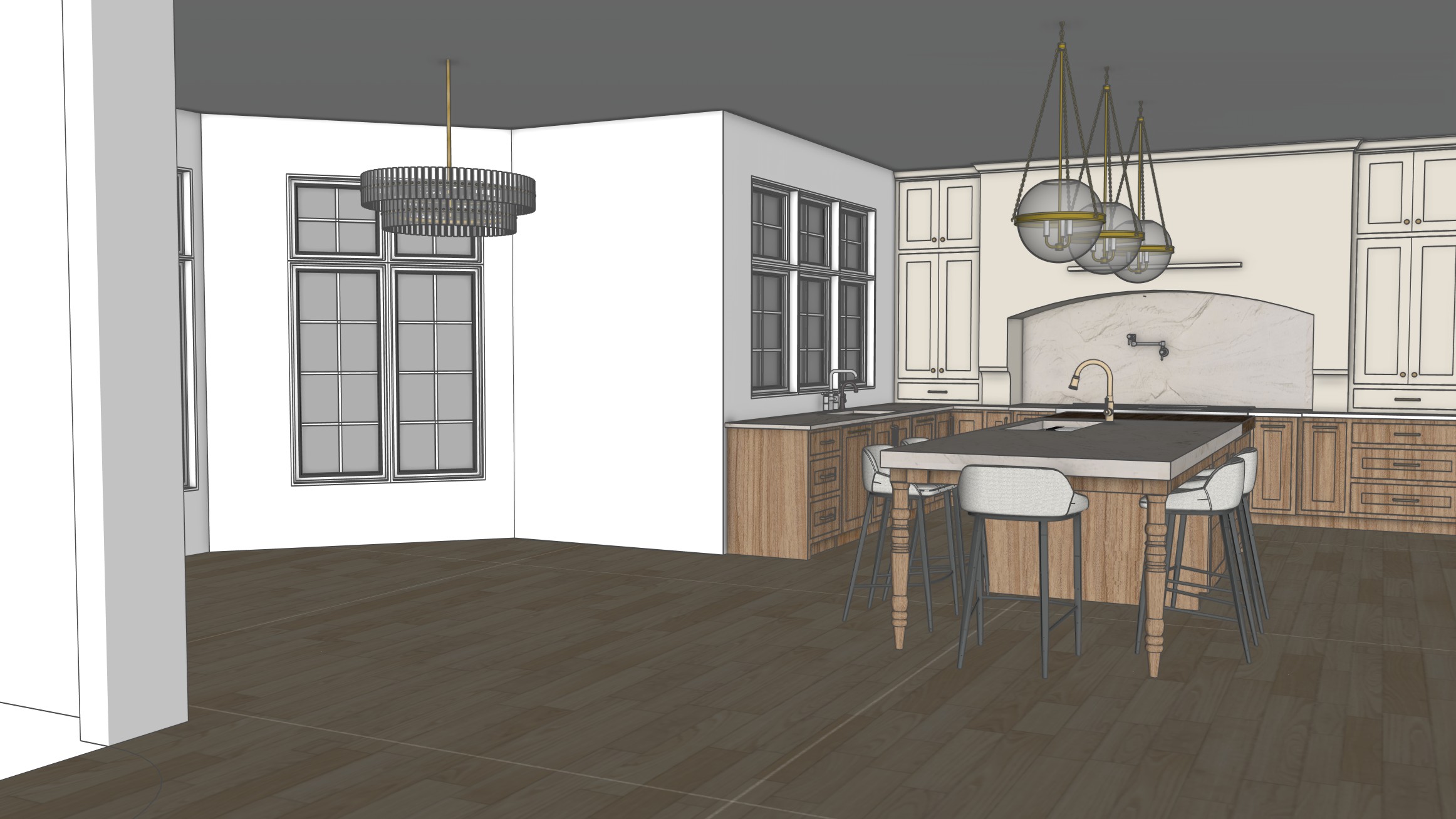 ultra realistic kitchen rendering based on a sketchup model realistic cabinetry materials sw shiitake painted range hood and hutches crystallo quartzite countertops with subtle veining accurate texture scale white oak floors with subtle wear and color variation matte painted walls with slight texture realistic fabric upholstery with visible weave physically accurate reflections and shadows soft indirect light global illumination professional interior photography crisp edges high detail clean modern aesthetic full frame camera 28mm lens
