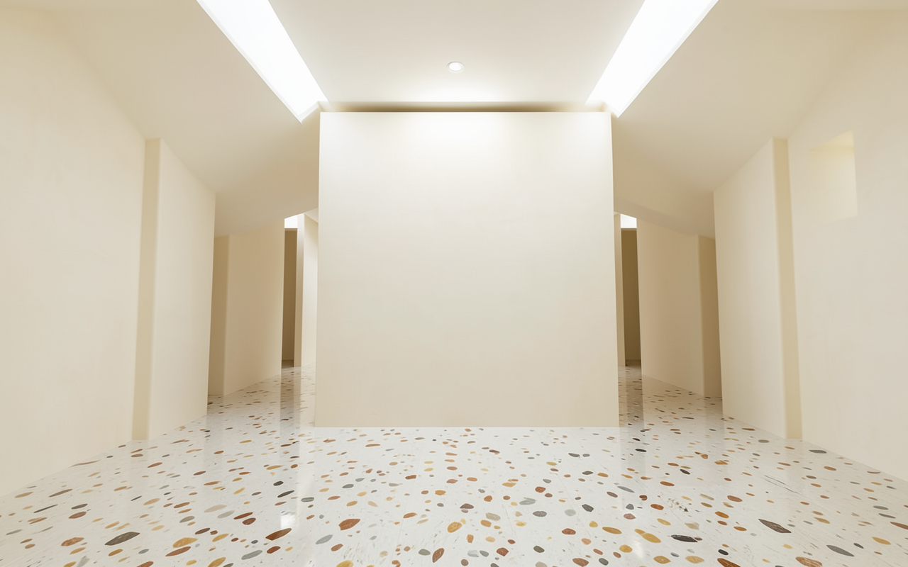 high end minimalist meditation hall monumental double height space pure white luminous ceiling soft daylight flooding from above bright but calm atmosphere 20 ft textured feature wall as focal point expansive empty floor area organic marble terrazzo with large aggregates seamless lime plaster walls minimal or no furniture quiet luxury spiritual environment wide angle architectural visualization emphasize lightness and serenity